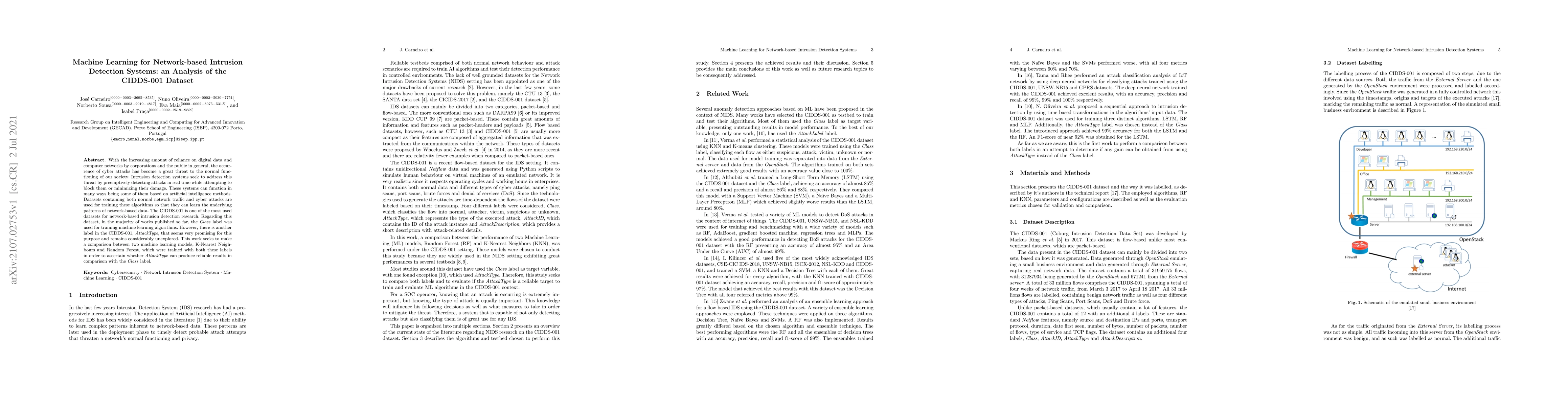 With the increasing amount of reliance on digital data and computer networks by corporations and the public in general, the occurrence of cyber attacks has become a great threat to the normal functioning of our society. Intrusion detection systems seek to address this threat by preemptively detecting attacks in real time while attempting to block them or minimizing their damage. These systems can function in many ways being some of them based on artificial intelligence methods. Datasets containing both normal network traffic and cyber attacks are used for training these algorithms so that they can learn the underlying patterns of network-based data. The CIDDS-001 is one of the most used datasets for network-based intrusion detection research. Regarding this dataset, in the majority of works published so far, the Class label was used for training machine learning algorithms. However, there is another label in the CIDDS-001, AttackType, that seems very promising for this purpose and remains considerably unexplored. This work seeks to make a comparison between two machine learning models, K-Nearest Neighbours and Random Forest, which were trained with both these labels in order to ascertain whether AttackType can produce reliable results in comparison with the Class label.