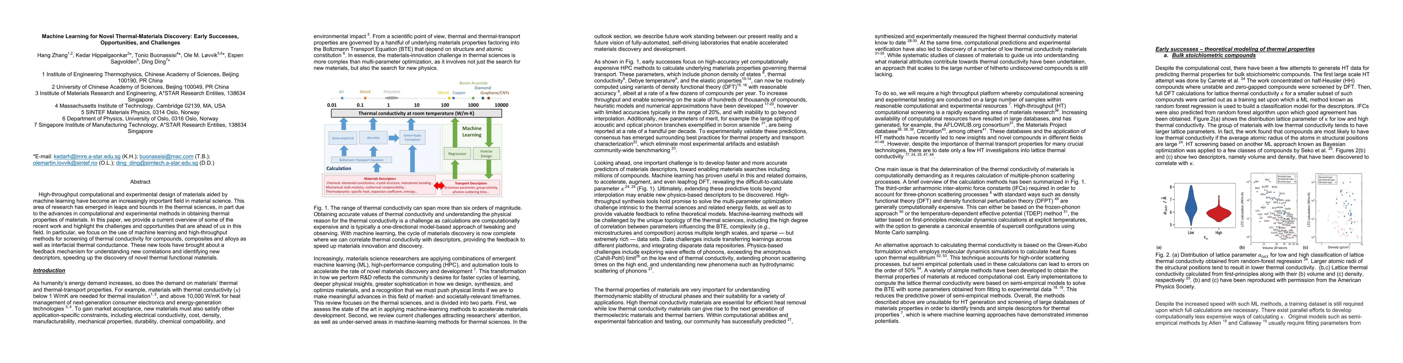 This paper reviews the advancements in machine learning for discovering novel thermal materials, emphasizing successes in high-throughput screening for thermal conductivity and interfacial thermal conductance. It also outlines the challenges and future opportunities in this rapidly evolving field.