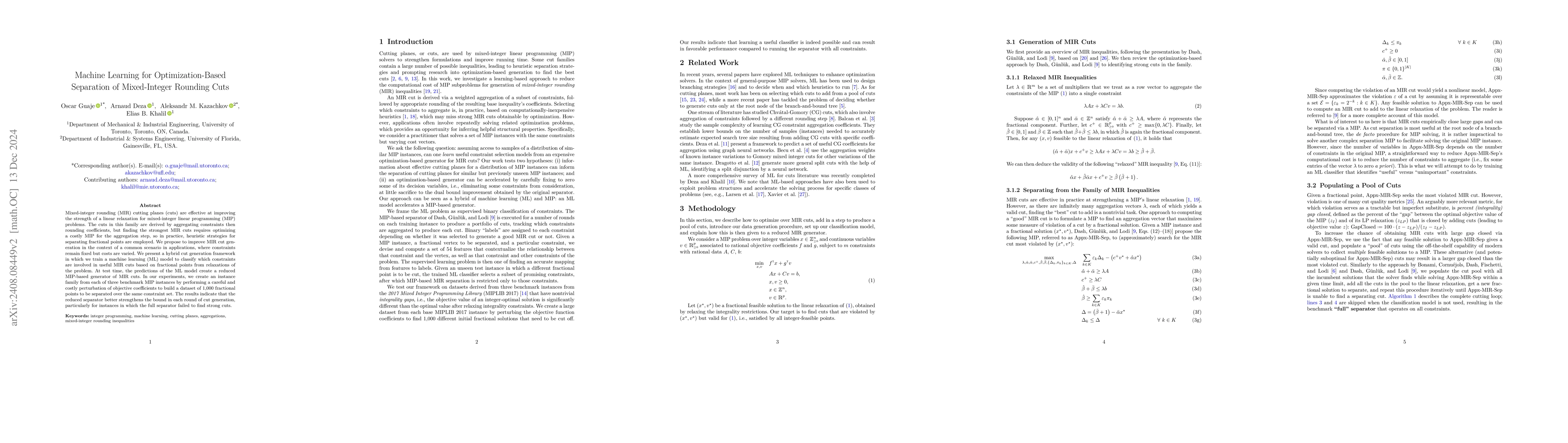 This research introduces a hybrid framework combining Machine Learning with optimization for generating Mixed-Integer Rounding cuts in Mixed-Integer Linear Programming. The framework trains an ML model to predict effective cuts, reducing the computational cost of MIP-based separation and improving dual bounds on MIPLIB2017 instances.