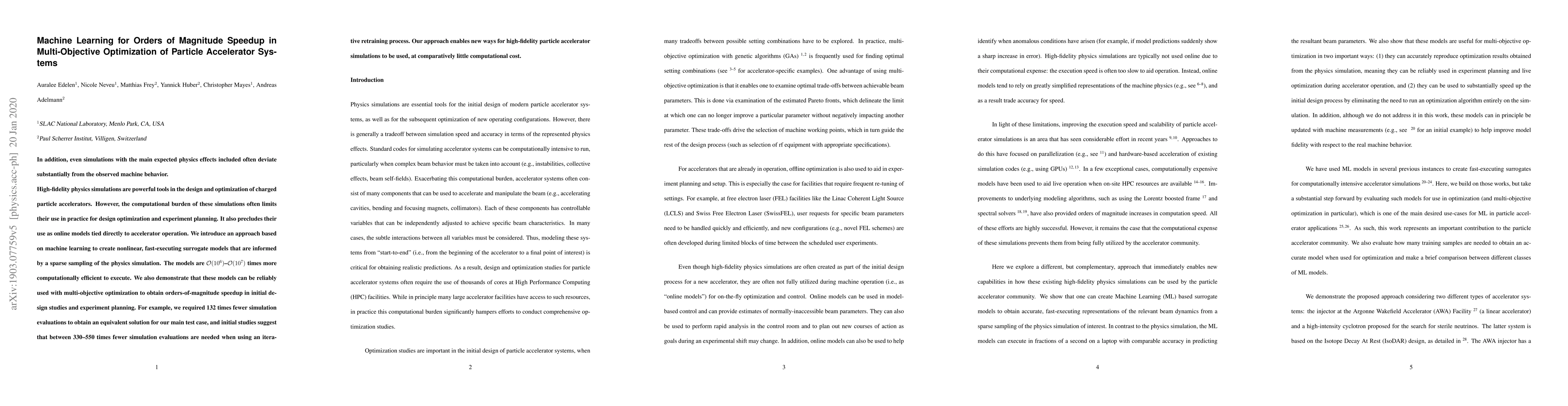 This paper proposes a machine learning-based approach to create fast surrogate models for high-fidelity physics simulations in particle accelerator design, achieving 10^6 to 10^7 times speedup. These models enable multi-objective optimization, reducing simulation evaluations by 132 times for initial studies and up to 550 times with iterative retraining.