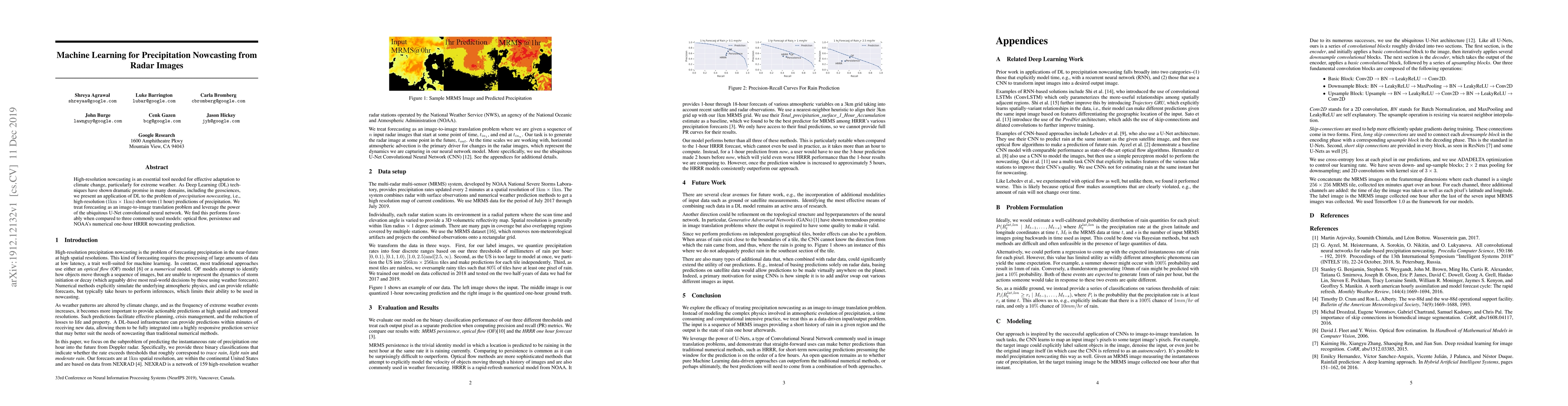 This research applies deep learning, specifically UNET convolutional neural networks, to accurately predict short-term precipitation (1 hour, 1 km x 1 km) using radar images, outperforming traditional methods like optical flow, persistence, and NOAA's HRRR model.