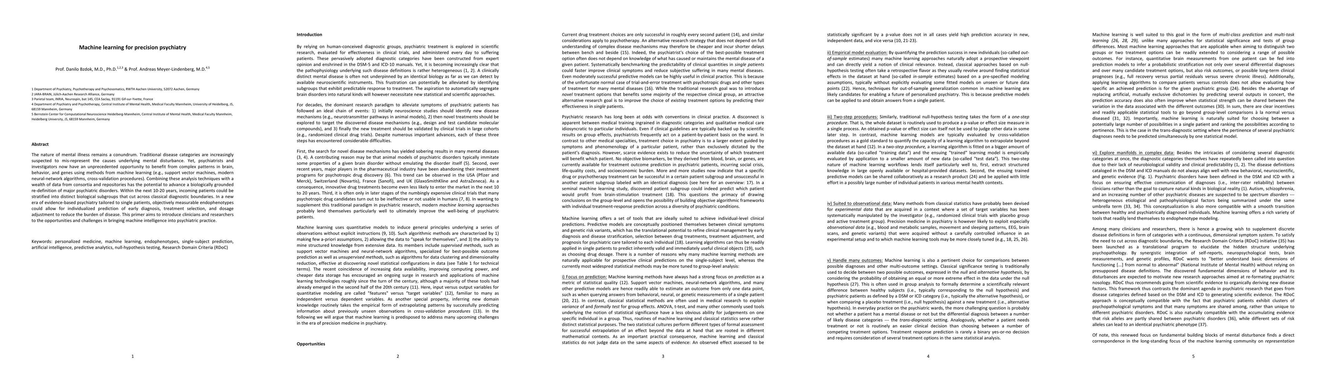 The nature of mental illness remains a conundrum. Traditional disease categories are increasingly suspected to mis-represent the causes underlying mental disturbance. Yet, psychiatrists and investigators now have an unprecedented opportunity to benefit from complex patterns in brain, behavior, and genes using methods from machine learning (e.g., support vector machines, modern neural-network algorithms, cross-validation procedures). Combining these analysis techniques with a wealth of data from consortia and repositories has the potential to advance a biologically grounded re-definition of major psychiatric disorders. Within the next 10-20 years, incoming patients could be stratified into distinct biological subgroups that cut across classical diagnostic boundaries. In a new era of evidence-based psychiatry tailored to single patients, objectively measurable endophenotypes could allow for individualized prediction of early diagnosis, treatment selection, and dosage adjustment to reduce the burden of disease. This primer aims to introduce clinicians and researchers to the opportunities and challenges in bringing machine intelligence into psychiatric practice.
