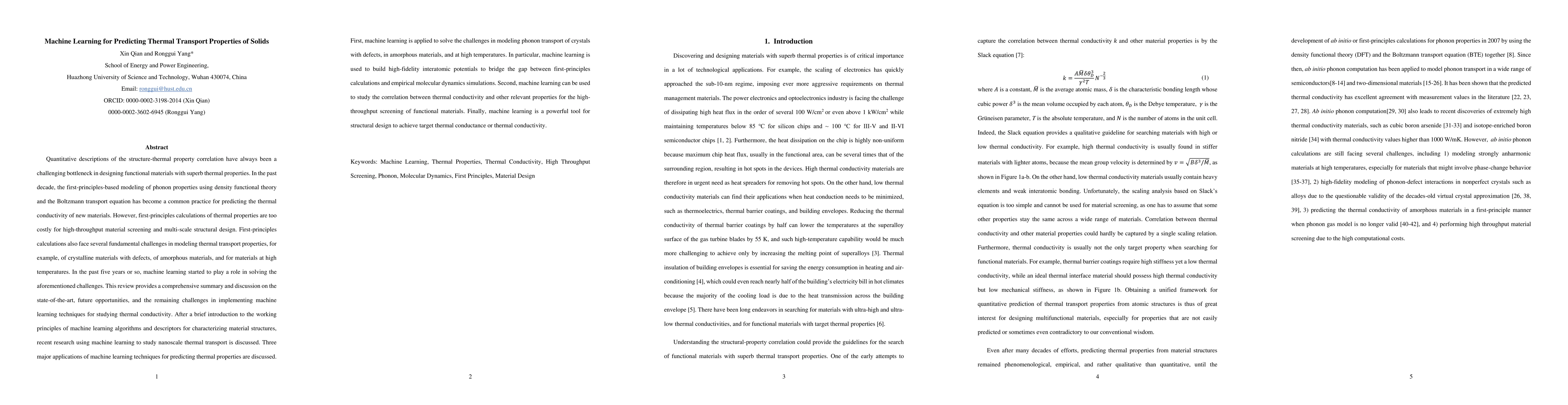 This paper reviews the application of machine learning in predicting thermal transport properties of solids, addressing the limitations of traditional first-principles calculations. It discusses how machine learning tackles challenges in modeling phonon transport, builds high-fidelity interatomic potentials, and facilitates high-throughput materials screening and structural design for desired thermal properties.