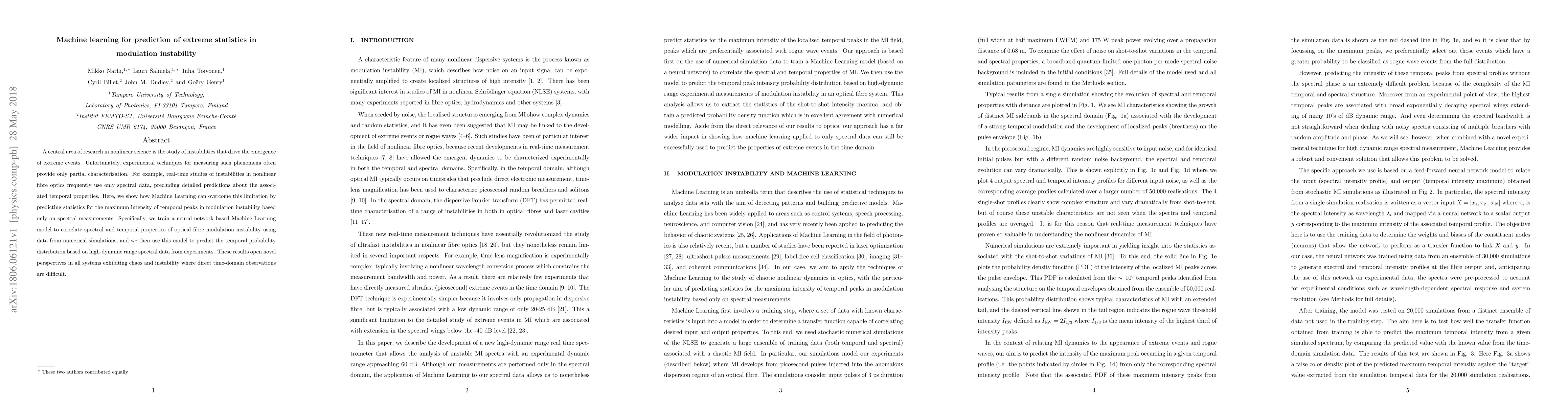 This paper demonstrates how machine learning, specifically neural networks, can predict the temporal statistics of extreme events in modulation instability in optical fibers using only spectral data, overcoming limitations of traditional experimental techniques. The trained model successfully predicts the temporal probability distribution based on spectral measurements from both simulations and experiments.
