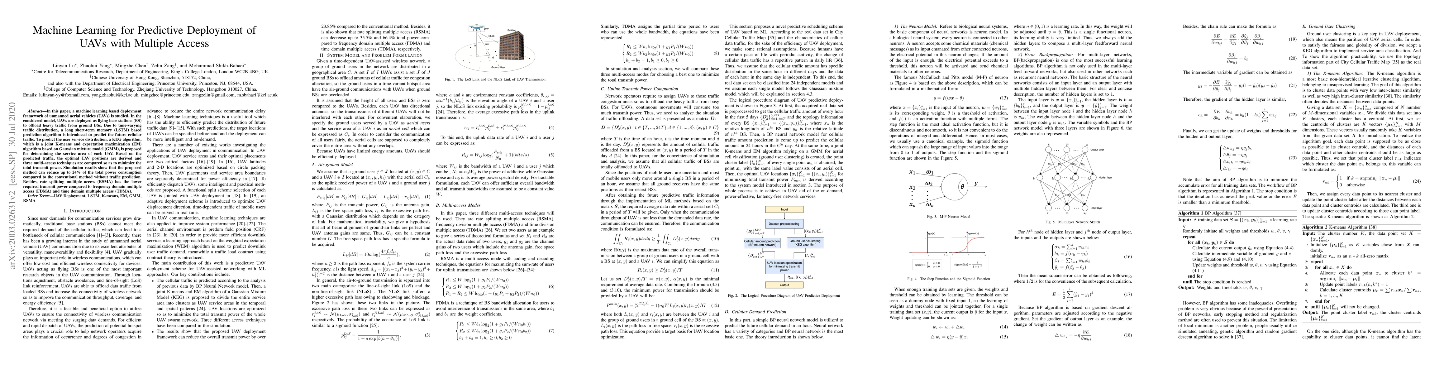 In this paper, a machine learning based deployment framework of unmanned aerial vehicles (UAVs) is studied. In the considered model, UAVs are deployed as flying base stations (BS) to offload heavy traffic from ground BSs. Due to time-varying traffic distribution, a long short-term memory (LSTM) based prediction algorithm is introduced to predict the future cellular traffic. To predict the user service distribution, a KEG algorithm, which is a joint K-means and expectation maximization (EM) algorithm based on Gaussian mixture model (GMM), is proposed for determining the service area of each UAV. Based on the predicted traffic, the optimal UAV positions are derived and three multi-access techniques are compared so as to minimize the total transmit power. Simulation results show that the proposed method can reduce up to 24\% of the total power consumption compared to the conventional method without traffic prediction. Besides, rate splitting multiple access (RSMA) has the lower required transmit power compared to frequency domain multiple access (FDMA) and time domain multiple access (TDMA).
