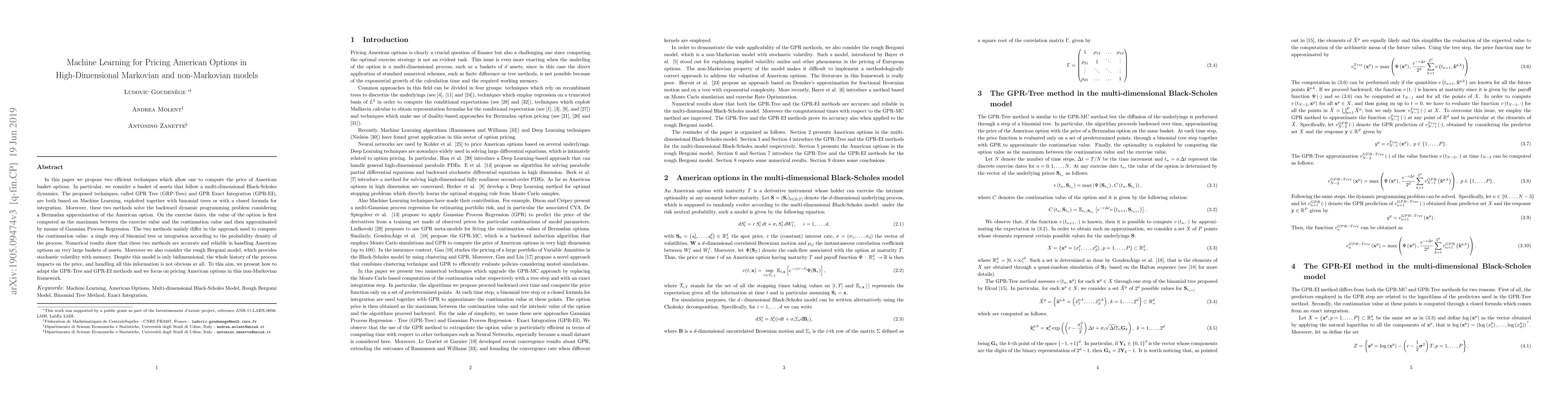 In this paper we propose two efficient techniques which allow one to compute the price of American basket options. In particular, we consider a basket of assets that follow a multi-dimensional Black-Scholes dynamics. The proposed techniques, called GPR Tree (GRP-Tree) and GPR Exact Integration (GPR-EI), are both based on Machine Learning, exploited together with binomial trees or with a closed formula for integration. Moreover, these two methods solve the backward dynamic programming problem considering a Bermudan approximation of the American option. On the exercise dates, the value of the option is first computed as the maximum between the exercise value and the continuation value and then approximated by means of Gaussian Process Regression. The two methods mainly differ in the approach used to compute the continuation value: a single step of binomial tree or integration according to the probability density of the process. Numerical results show that these two methods are accurate and reliable in handling American options on very large baskets of assets. Moreover we also consider the rough Bergomi model, which provides stochastic volatility with memory. Despite this model is only bidimensional, the whole history of the process impacts on the price, and handling all this information is not obvious at all. To this aim, we present how to adapt the GPR-Tree and GPR-EI methods and we focus on pricing American options in this non-Markovian framework.