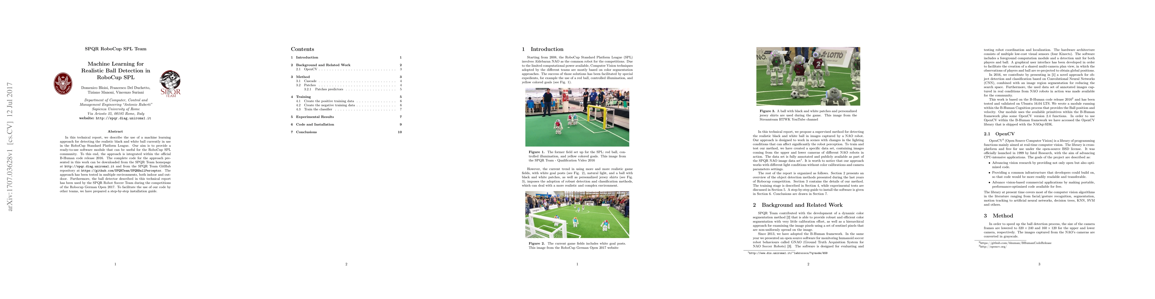 In this technical report, we describe the use of a machine learning approach for detecting the realistic black and white ball currently in use in the RoboCup Standard Platform League. Our aim is to provide a ready-to-use software module that can be useful for the RoboCup SPL community. To this end, the approach is integrated within the official B-Human code release 2016. The complete code for the approach presented in this work can be downloaded from the SPQR Team homepage at http://spqr.diag.uniroma1.it and from the SPQR Team GitHub repository at https://github.com/SPQRTeam/SPQRBallPerceptor. The approach has been tested in multiple environments, both indoor and outdoor. Furthermore, the ball detector described in this technical report has been used by the SPQR Robot Soccer Team during the competitions of the Robocup German Open 2017. To facilitate the use of our code by other teams, we have prepared a step-by-step installation guide.