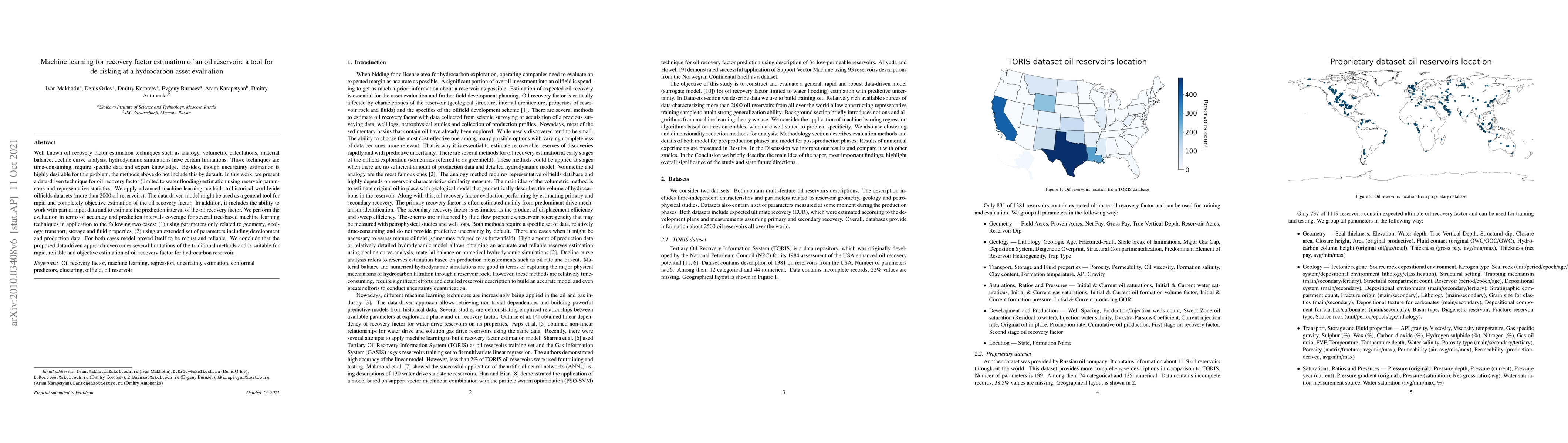 This paper proposes a machine learning-based method for estimating oil recovery factors in oil reservoirs, overcoming traditional techniques' limitations of time-consumption, data dependency, and lack of uncertainty estimation. The model, trained on extensive worldwide datasets, provides rapid and objective recovery factor estimations, including prediction intervals, using both basic and extended reservoir parameters.