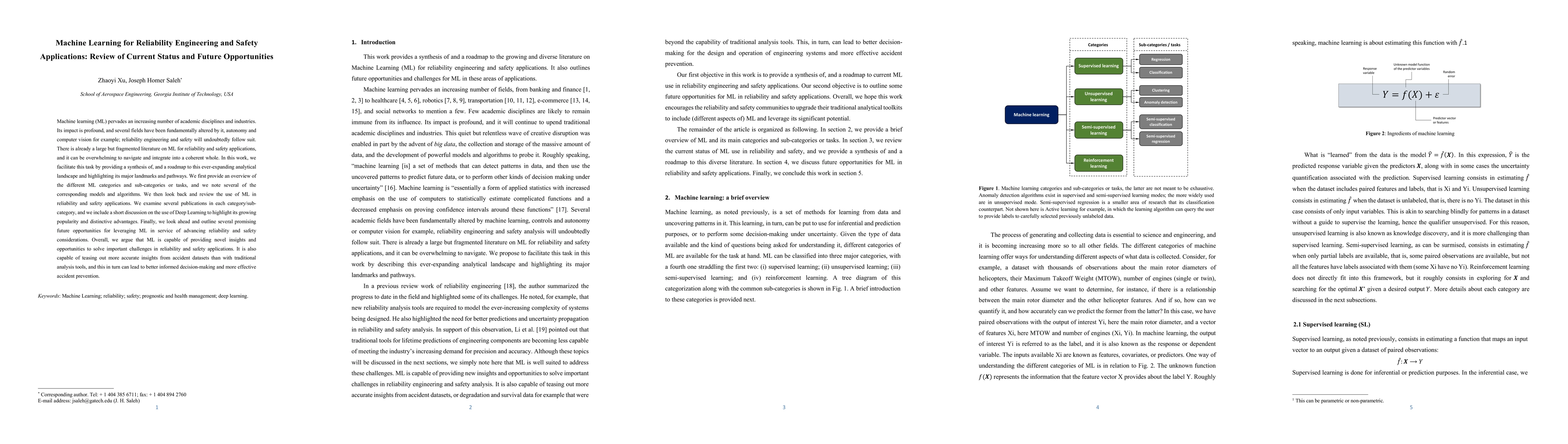This paper synthesizes the current landscape of machine learning applications in reliability engineering and safety, reviewing existing literature, highlighting key models, and discussing the growing use of deep learning. It also outlines future opportunities for leveraging ML to enhance reliability and safety, arguing that ML can provide more accurate insights and better inform decision-making for accident prevention.