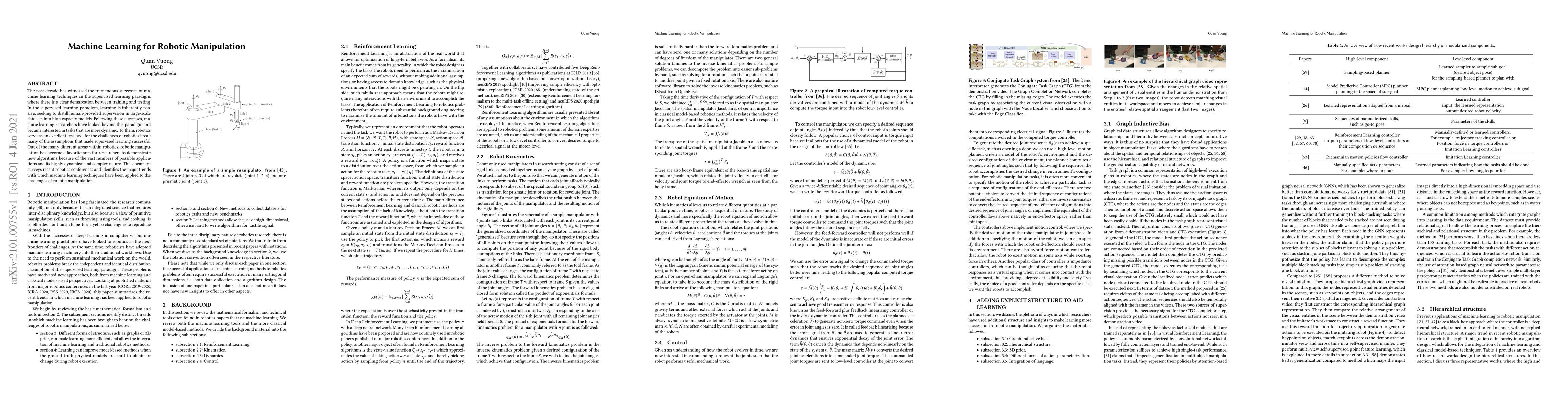 The past decade has witnessed the tremendous successes of machine learning techniques in the supervised learning paradigm, where there is a clear demarcation between training and testing. In the supervised learning paradigm, learning is inherently passive, seeking to distill human-provided supervision in large-scale datasets into high capacity models. Following these successes, machine learning researchers have looked beyond this paradigm and became interested in tasks that are more dynamic. To them, robotics serve as an excellent test-bed, for the challenges of robotics break many of the assumptions that made supervised learning successful. Out of the many different areas within robotics, robotic manipulation has become a favorite area for researchers to demonstrate new algorithms because of the vast numbers of possible applications and its highly dynamical and complex nature. This document surveys recent robotics conferences and identifies the major trends with which machine learning techniques have been applied to the challenges of robotic manipulation.