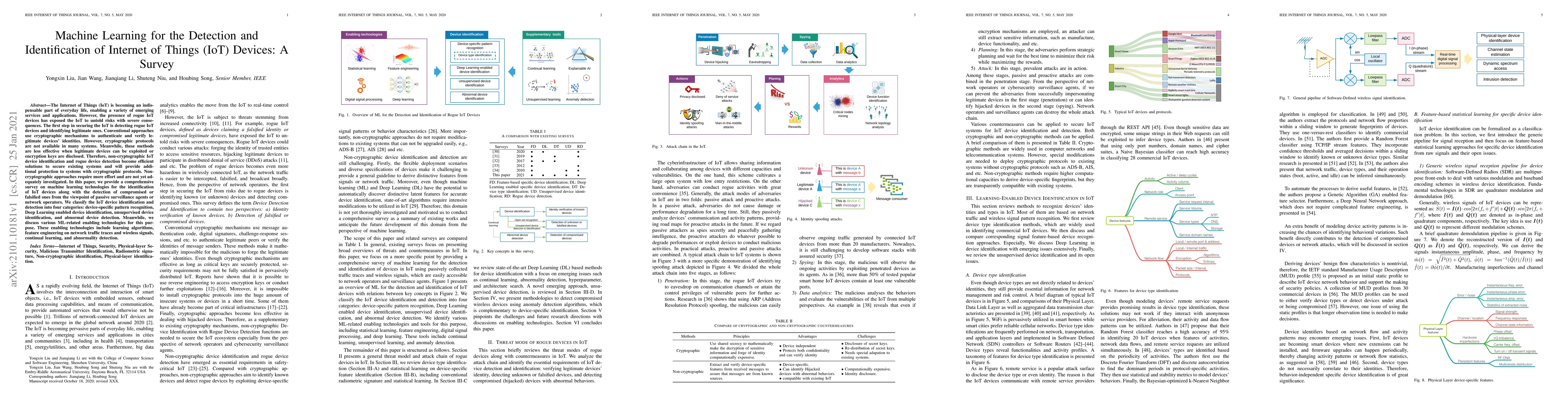 This paper surveys machine learning techniques for detecting and identifying IoT devices, focusing on non-cryptographic methods. It categorizes approaches into device-specific pattern recognition, Deep Learning, unsupervised identification, and anomaly detection, alongside discussing related enabling technologies like learning algorithms and feature engineering.