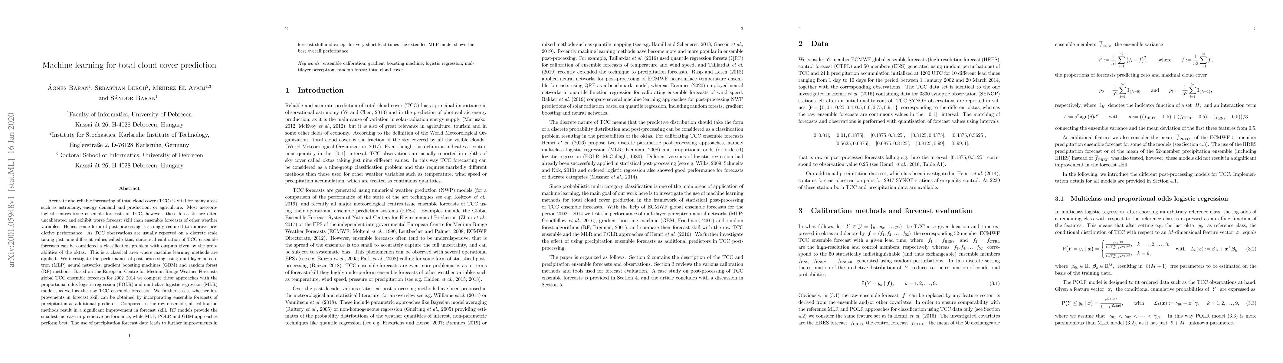 This paper investigates machine learning methods for post-processing ensemble forecasts of total cloud cover (TCC), finding that multilayer perceptrons, gradient boosting machines, and random forests improve TCC forecast skill compared to traditional regression models. The inclusion of precipitation forecast data further enhances performance, with MLP showing the best overall results.