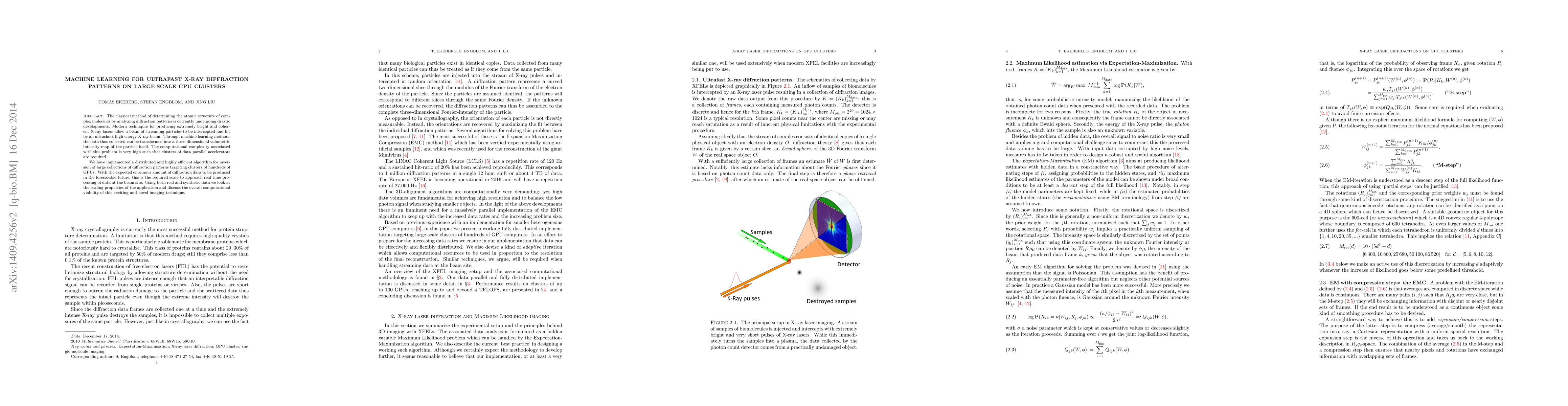 This paper presents a machine learning approach for analyzing ultrafast X-ray diffraction patterns to determine atomic structures, implemented on large-scale GPU clusters. The authors propose an efficient algorithm for real-time processing of large diffraction datasets, demonstrating its scalability and computational feasibility.
