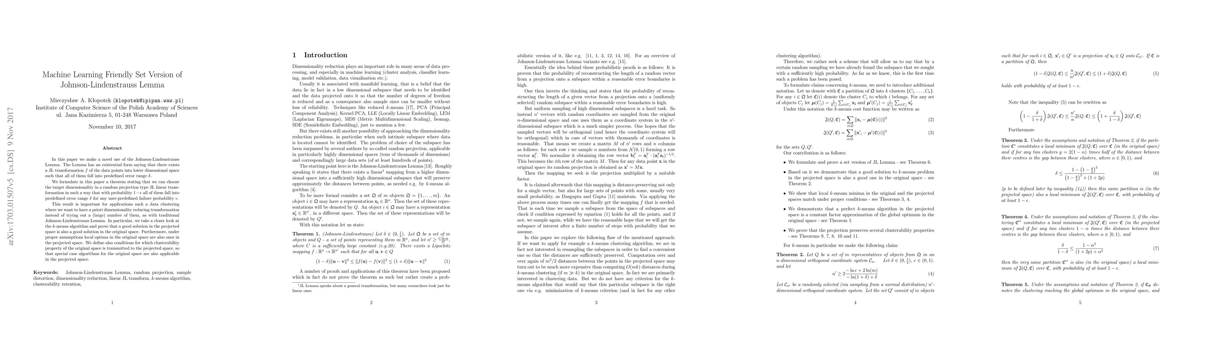 In this paper we make a novel use of the Johnson-Lindenstrauss Lemma. The Lemma has an existential form saying that there exists a JL transformation $f$ of the data points into lower dimensional space such that all of them fall into predefined error range $\delta$. We formulate in this paper a theorem stating that we can choose the target dimensionality in a random projection type JL linear transformation in such a way that with probability $1-\epsilon$ all of them fall into predefined error range $\delta$ for any user-predefined failure probability $\epsilon$. This result is important for applications such a data clustering where we want to have a priori dimensionality reducing transformation instead of trying out a (large) number of them, as with traditional Johnson-Lindenstrauss Lemma. In particular, we take a closer look at the $k$-means algorithm and prove that a good solution in the projected space is also a good solution in the original space. Furthermore, under proper assumptions local optima in the original space are also ones in the projected space. We define also conditions for which clusterability property of the original space is transmitted to the projected space, so that special case algorithms for the original space are also applicable in the projected space.