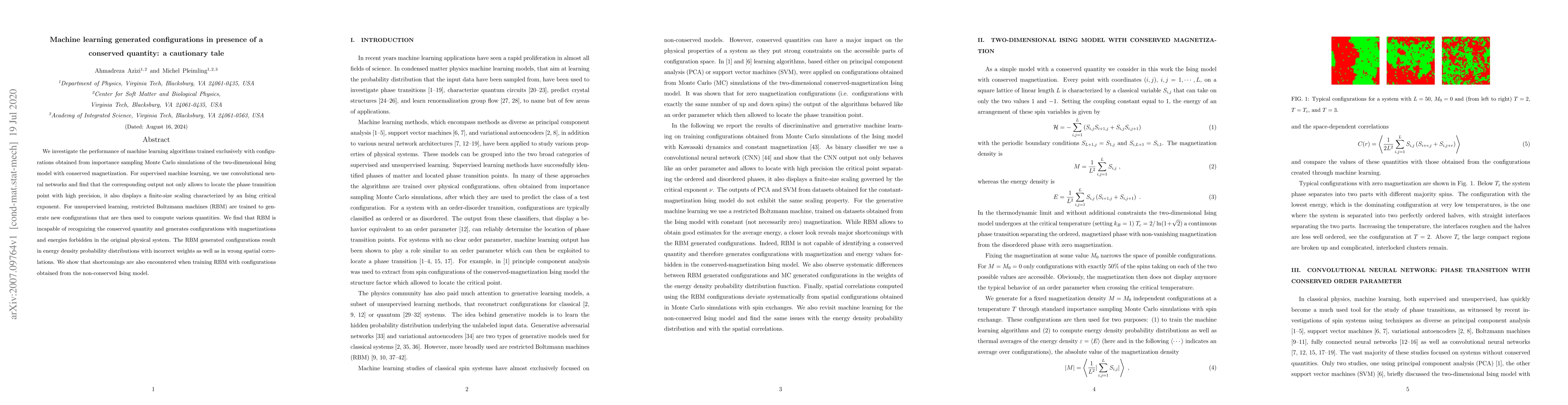 This paper examines machine learning algorithms trained on configurations from the Ising model with conserved magnetization, finding precise phase transition detection with convolutional neural networks but highlighting significant issues with unsupervised learning via restricted Boltzmann machines, which fail to recognize conserved quantities and produce incorrect configurations.