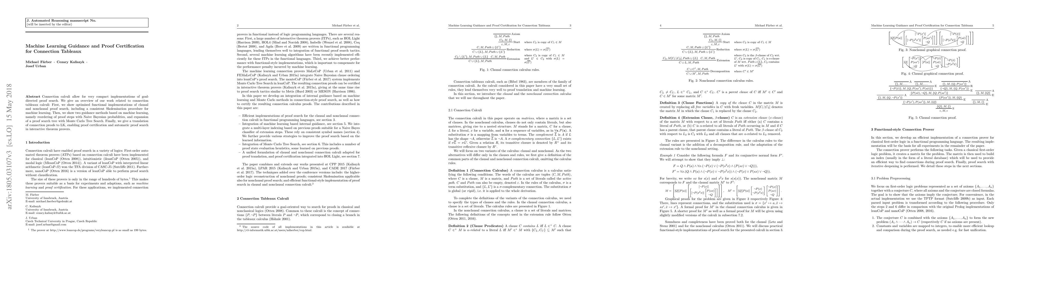 This paper presents optimized functional implementations for connection tableaux calculi, including machine learning-guided proof search techniques and a translation method for proof certification in interactive theorem provers. It employs Naive Bayesian probabilities and Monte Carlo Tree Search for proof guidance.