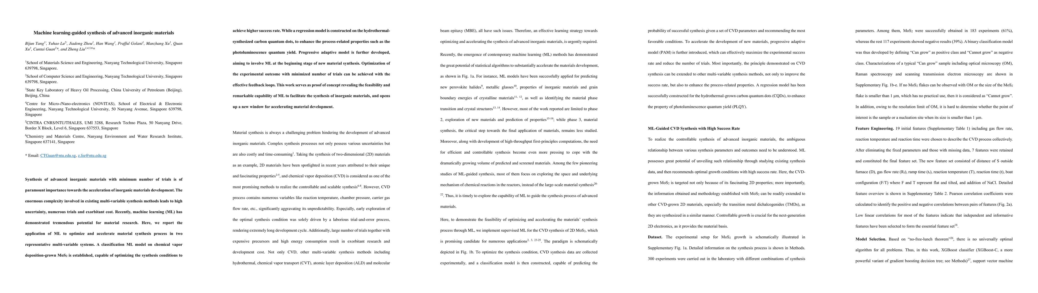 This paper explores the use of machine learning to optimize and accelerate the synthesis of advanced inorganic materials, demonstrating significant improvements in the success rate and properties of materials like MoS2 and carbon quantum dots through classification and regression models. The study highlights the potential of ML for reducing trial numbers and costs in material development.