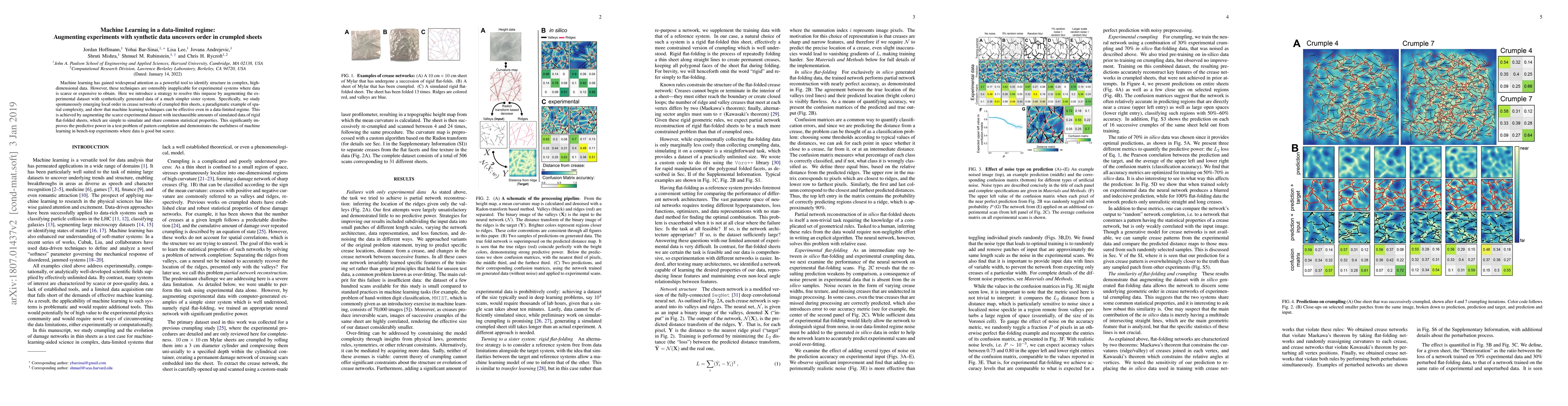 Machine learning has gained widespread attention as a powerful tool to identify structure in complex, high-dimensional data. However, these techniques are ostensibly inapplicable for experimental systems where data is scarce or expensive to obtain. Here we introduce a strategy to resolve this impasse by augmenting the experimental dataset with synthetically generated data of a much simpler sister system. Specifically, we study spontaneously emerging local order in crease networks of crumpled thin sheets, a paradigmatic example of spatial complexity, and show that machine learning techniques can be effective even in a data-limited regime. This is achieved by augmenting the scarce experimental dataset with inexhaustible amounts of simulated data of rigid flat-folded sheets, which are simple to simulate and share common statistical properties. This significantly improves the predictive power in a test problem of pattern completion and demonstrates the usefulness of machine learning in bench-top experiments where data is good but scarce.