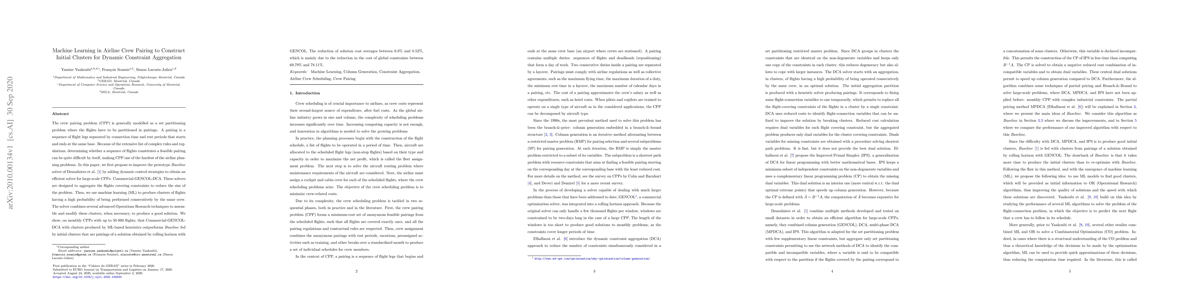 This paper proposes an advanced machine learning approach to improve crew pairing in airline operations by dynamically aggregating constraints and generating flight clusters likely to be performed consecutively. The new solver, Commercial-GENCOL-DCA, outperforms a baseline method, achieving an average cost reduction of 6.8% to 8.52% by significantly lowering global constraint costs.