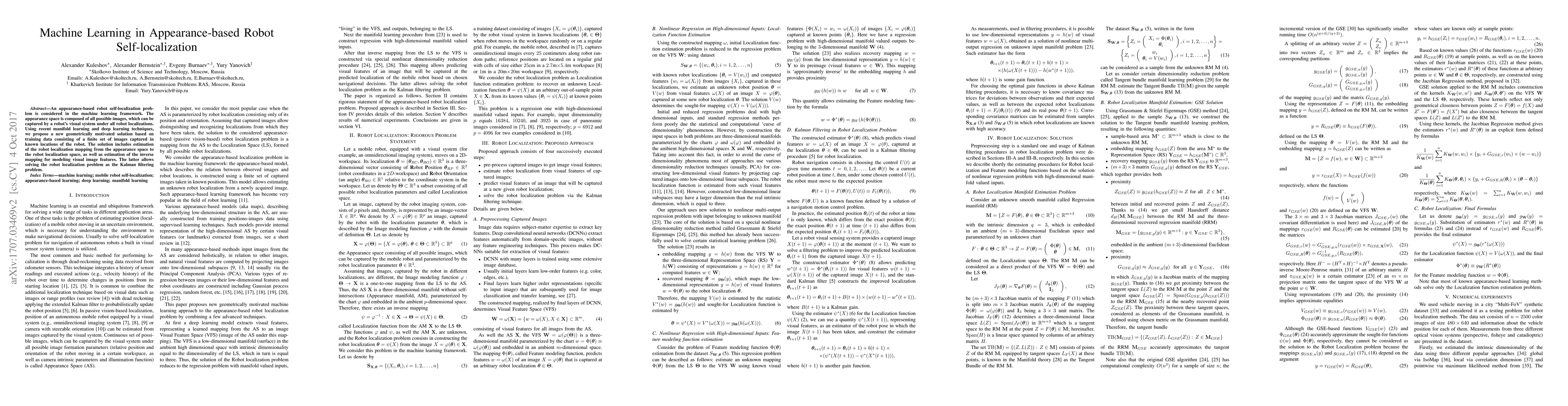 This paper proposes a machine learning approach for appearance-based robot self-localization using manifold learning and deep learning techniques. It estimates the robot's localization from visual images and models visual image features to solve the localization problem via Kalman filtering.