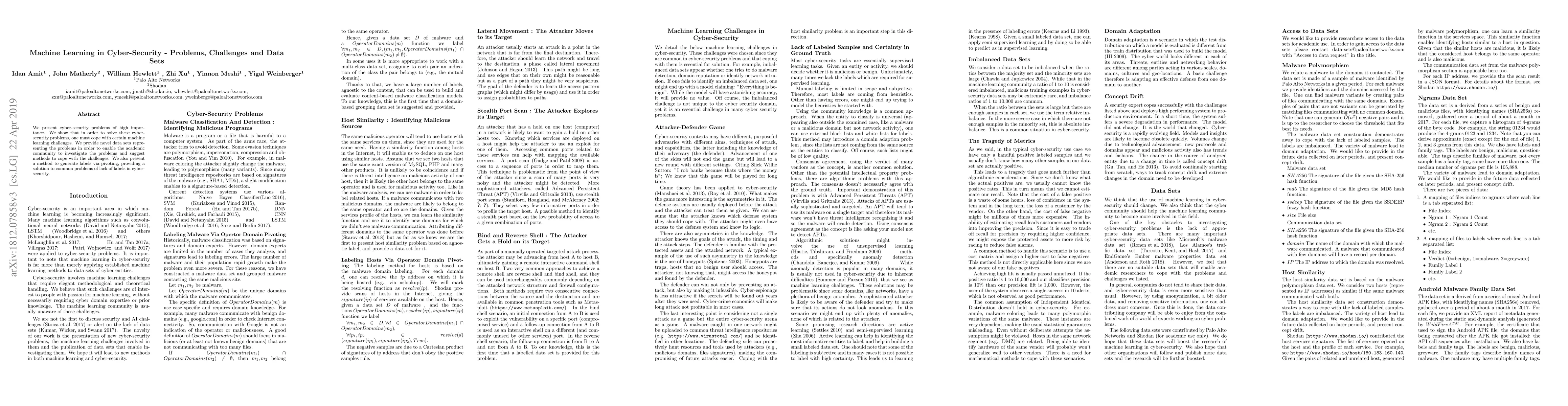 This paper discusses critical cyber-security issues and the machine learning challenges they pose, offering new datasets to facilitate research. It also introduces a method for generating labels through pivoting to address the common issue of insufficient labeled data in cyber-security studies.