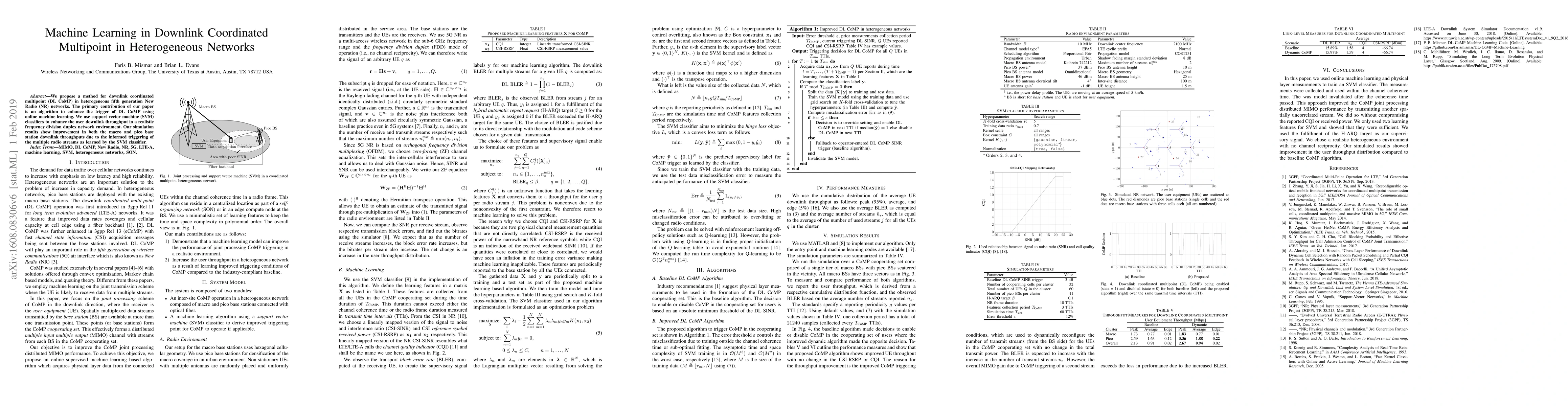 This paper proposes a machine learning-based algorithm for enhancing downlink coordinated multipoint (DL CoMP) in fifth generation NR heterogeneous networks. Using support vector machine classifiers, the method improves user downlink throughput, resulting in better performance for both macro and pico base stations, as demonstrated by simulation results.