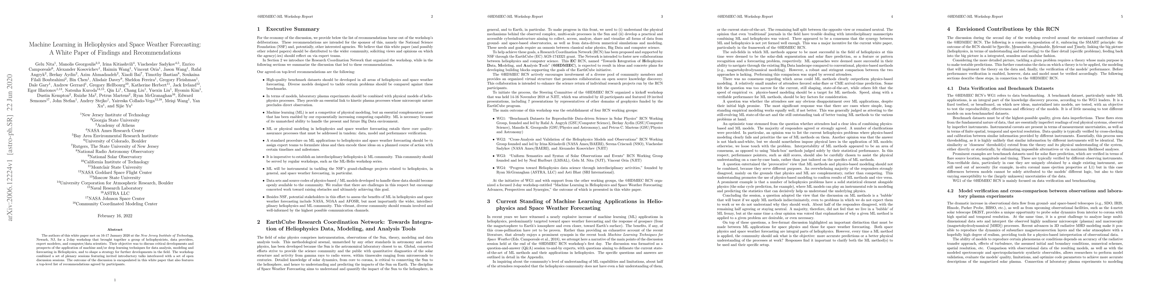 The authors of this white paper met on 16-17 January 2020 at the New Jersey Institute of Technology, Newark, NJ, for a 2-day workshop that brought together a group of heliophysicists, data providers, expert modelers, and computer/data scientists. Their objective was to discuss critical developments and prospects of the application of machine and/or deep learning techniques for data analysis, modeling and forecasting in Heliophysics, and to shape a strategy for further developments in the field. The workshop combined a set of plenary sessions featuring invited introductory talks interleaved with a set of open discussion sessions. The outcome of the discussion is encapsulated in this white paper that also features a top-level list of recommendations agreed by participants.