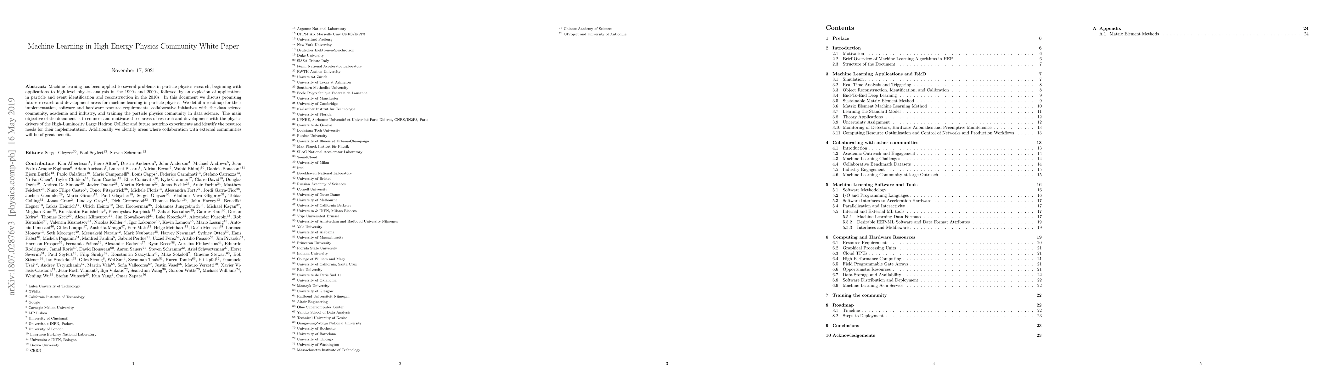 Machine learning has been applied to several problems in particle physics research, beginning with applications to high-level physics analysis in the 1990s and 2000s, followed by an explosion of applications in particle and event identification and reconstruction in the 2010s. In this document we discuss promising future research and development areas for machine learning in particle physics. We detail a roadmap for their implementation, software and hardware resource requirements, collaborative initiatives with the data science community, academia and industry, and training the particle physics community in data science. The main objective of the document is to connect and motivate these areas of research and development with the physics drivers of the High-Luminosity Large Hadron Collider and future neutrino experiments and identify the resource needs for their implementation. Additionally we identify areas where collaboration with external communities will be of great benefit.