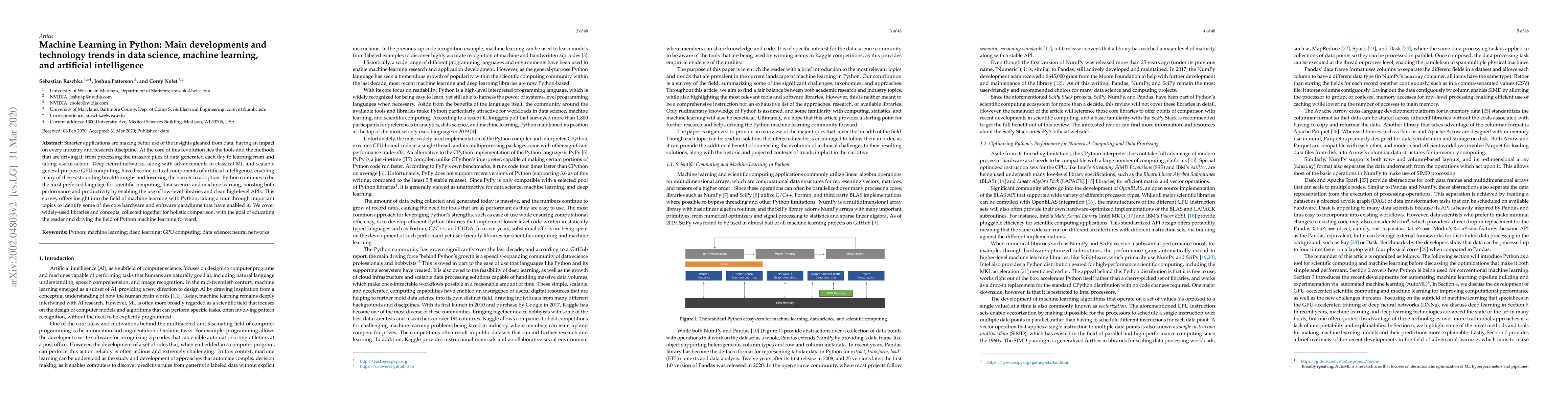 Smarter applications are making better use of the insights gleaned from data, having an impact on every industry and research discipline. At the core of this revolution lies the tools and the methods that are driving it, from processing the massive piles of data generated each day to learning from and taking useful action. Deep neural networks, along with advancements in classical ML and scalable general-purpose GPU computing, have become critical components of artificial intelligence, enabling many of these astounding breakthroughs and lowering the barrier to adoption. Python continues to be the most preferred language for scientific computing, data science, and machine learning, boosting both performance and productivity by enabling the use of low-level libraries and clean high-level APIs. This survey offers insight into the field of machine learning with Python, taking a tour through important topics to identify some of the core hardware and software paradigms that have enabled it. We cover widely-used libraries and concepts, collected together for holistic comparison, with the goal of educating the reader and driving the field of Python machine learning forward.