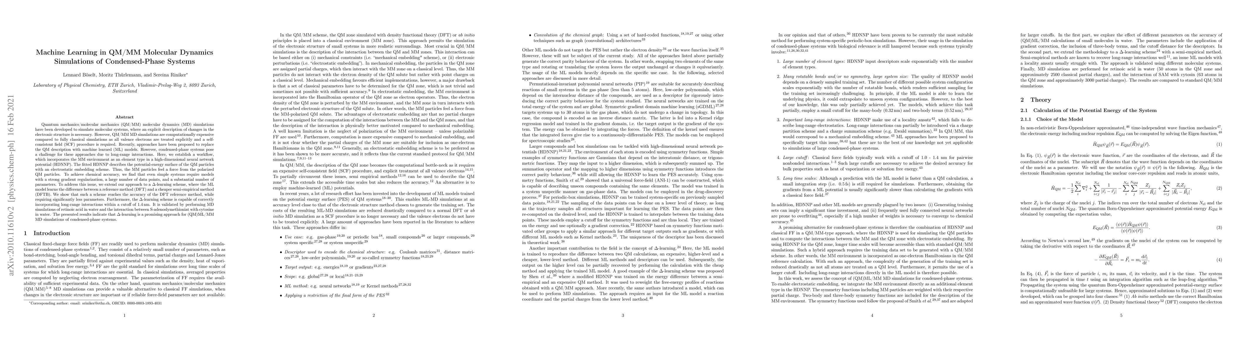 This paper proposes a machine learning approach to enhance QM/MM MD simulations of condensed-phase systems by using a high-dimensional neural network potential (HDNNP) and a delta-learning scheme to achieve chemical accuracy with reduced computational cost, validated by simulations of retinoic acid and S-adenosylmethionine interactions.