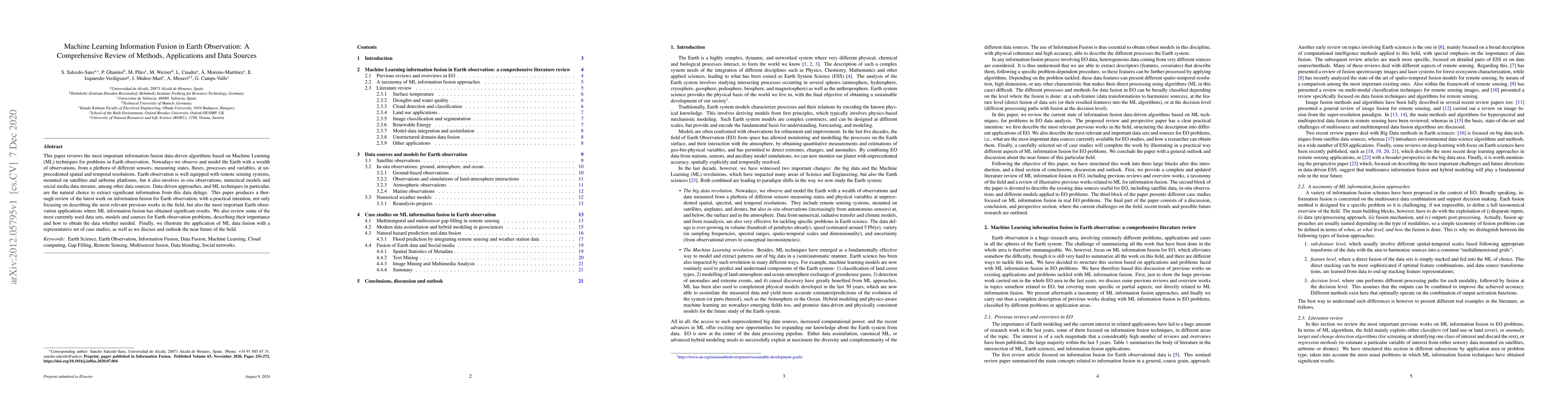This paper provides a comprehensive review of machine learning techniques for information fusion in Earth observation, highlighting key algorithms, applications, and data sources. It also discusses current datasets and models, presents case studies, and offers insights into future trends in the field.