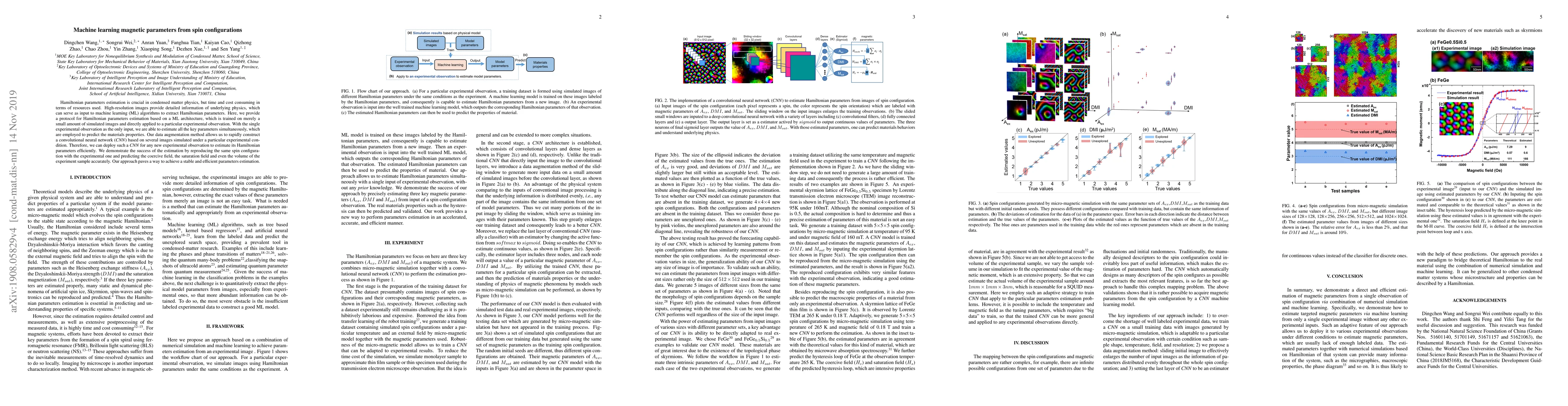 Hamiltonian parameter estimation is crucial in condensed matter physics, but time and cost consuming in terms of resources used. With advances in observation techniques, high-resolution images with more detailed information are obtained, which can serve as an input to machine learning (ML) algorithms to extract Hamiltonian parameters. However, the number of labeled images is rather limited. Here, we provide a protocol for Hamiltonian parameter estimation based on a machine learning architecture, which is trained on a small amount of simulated images and applied to experimental spin configuration images. Sliding windows on the input images enlarges the number of training images; therefore we can train well a neural network on a small dataset of simulated images which are generated adaptively using the same external conditions such as temperature and magnetic field as the experiment. The neural network is applied to the experimental image and estimates magnetic parameters efficiently. We demonstrate the success of the estimation by reproducing the same configuration from simulation and predict a hysteresis loop accurately. Our approach paves a way to a stable and general parameter estimation.