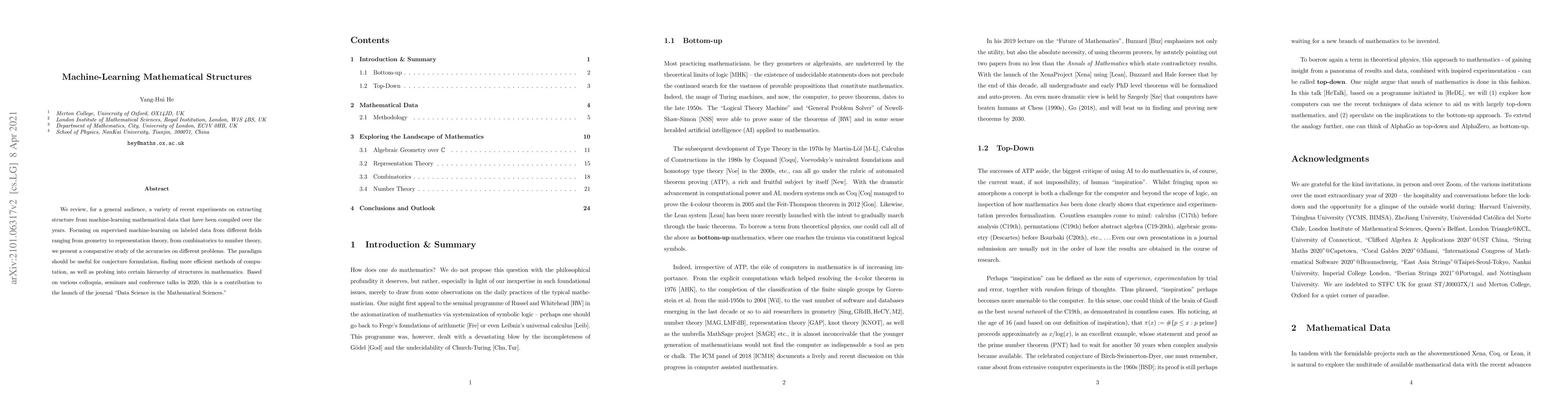 We review, for a general audience, a variety of recent experiments on extracting structure from machine-learning mathematical data that have been compiled over the years. Focusing on supervised machine-learning on labeled data from different fields ranging from geometry to representation theory, from combinatorics to number theory, we present a comparative study of the accuracies on different problems. The paradigm should be useful for conjecture formulation, finding more efficient methods of computation, as well as probing into certain hierarchy of structures in mathematics.