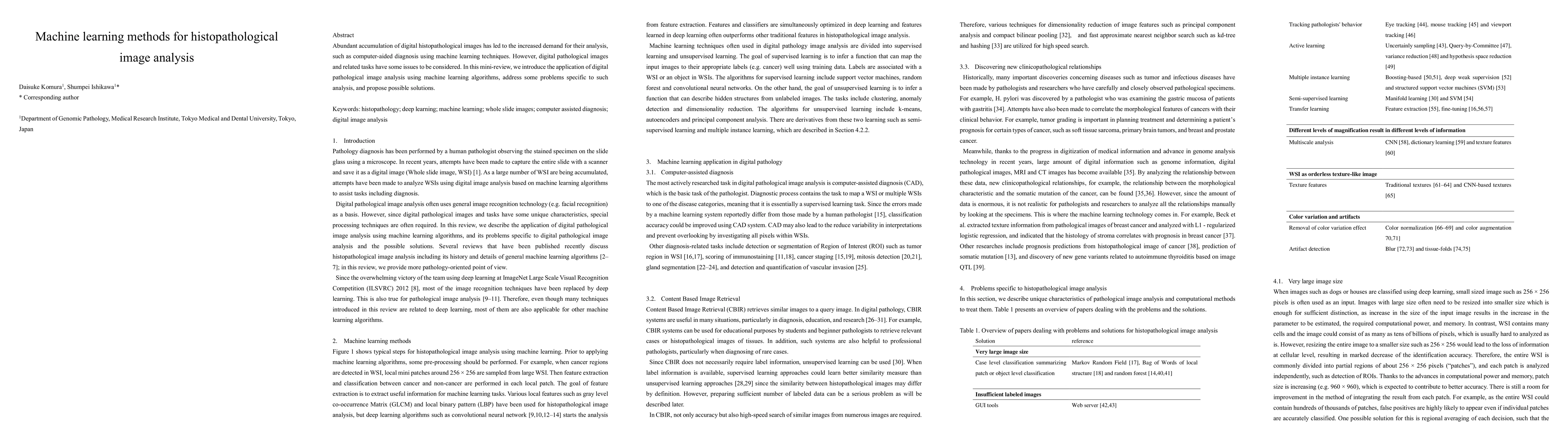 Abundant accumulation of digital histopathological images has led to the increased demand for their analysis, such as computer-aided diagnosis using machine learning techniques. However, digital pathological images and related tasks have some issues to be considered. In this mini-review, we introduce the application of digital pathological image analysis using machine learning algorithms, address some problems specific to such analysis, and propose possible solutions.