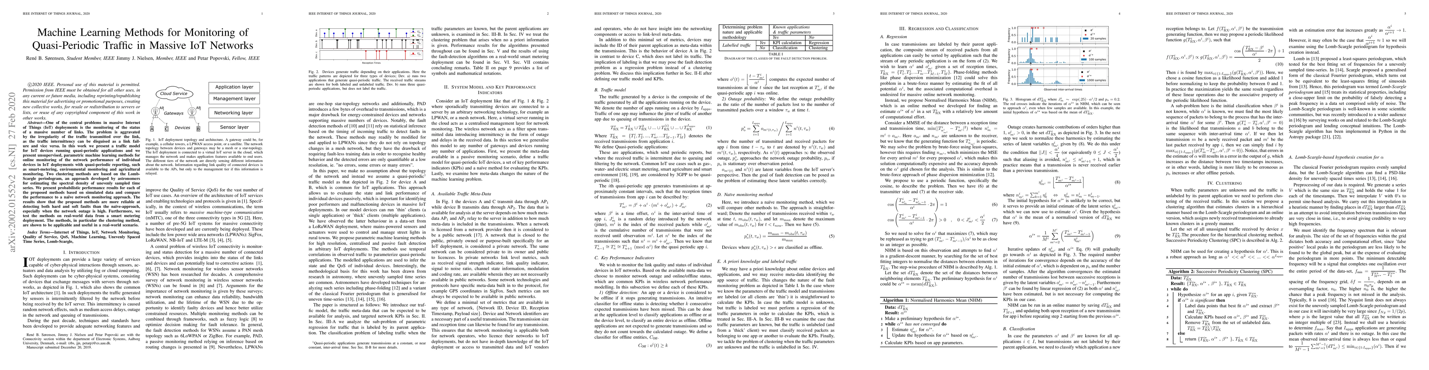 One of the central problems in massive Internet of Things (IoT) deployments is the monitoring of the status of a massive number of links. The problem is aggravated by the irregularity of the traffic transmitted over the link, as the traffic intermittency can be disguised as a link failure and vice versa. In this work we present a traffic model for IoT devices running quasi-periodic applications and we present both supervised and unsupervised machine learning methods for monitoring the network performance of IoT deployments with quasi-periodic reporting, such as smart-metering, environmental monitoring and agricultural monitoring. The unsupervised methods are based on the Lomb-Scargle periodogram, an approach developed by astronomers for estimating the spectral density of unevenly sampled time series.