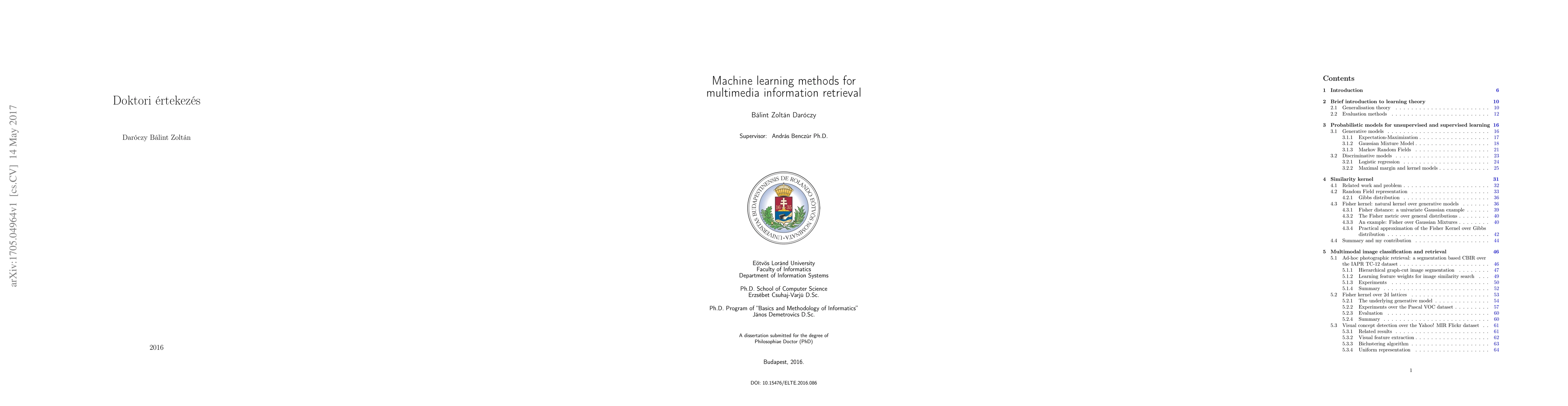 In this thesis we examined several multimodal feature extraction and learning methods for retrieval and classification purposes. We reread briefly some theoretical results of learning in Section 2 and reviewed several generative and discriminative models in Section 3 while we described the similarity kernel in Section 4. We examined different aspects of the multimodal image retrieval and classification in Section 5 and suggested methods for identifying quality assessments of Web documents in Section 6. In our last problem we proposed similarity kernel for time-series based classification. The experiments were carried over publicly available datasets and source codes for the most essential parts are either open source or released. Since the used similarity graphs (Section 4.2) are greatly constrained for computational purposes, we would like to continue work with more complex, evolving and capable graphs and apply for different problems such as capturing the rapid change in the distribution (e.g. session based recommendation) or complex graphs of the literature work. The similarity kernel with the proper metrics reaches and in many cases improves over the state-of-the-art. Hence we may conclude generative models based on instance similarities with multiple modes is a generally applicable model for classification and regression tasks ranging over various domains, including but not limited to the ones presented in this thesis. More generally, the Fisher kernel is not only unique in many ways but one of the most powerful kernel functions. Therefore we may exploit the Fisher kernel in the future over widely used generative models, such as Boltzmann Machines [Hinton et al., 1984], a particular subset, the Restricted Boltzmann Machines and Deep Belief Networks [Hinton et al., 2006]), Latent Dirichlet Allocation [Blei et al., 2003] or Hidden Markov Models [Baum and Petrie, 1966] to name a few.