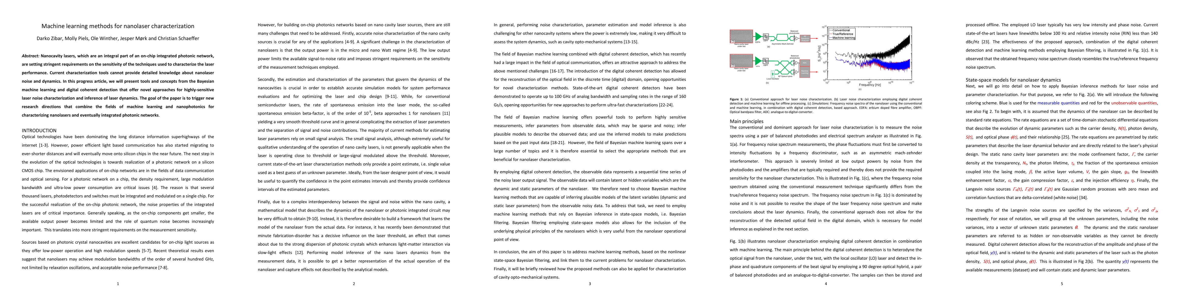 Nanocavity lasers, which are an integral part of an on-chip integrated photonic network, are setting stringent requirements on the sensitivity of the techniques used to characterize the laser performance. Current characterization tools cannot provide detailed knowledge about nanolaser noise and dynamics. In this progress article, we will present tools and concepts from the Bayesian machine learning and digital coherent detection that offer novel approaches for highly-sensitive laser noise characterization and inference of laser dynamics. The goal of the paper is to trigger new research directions that combine the fields of machine learning and nanophotonics for characterizing nanolasers and eventually integrated photonic networks