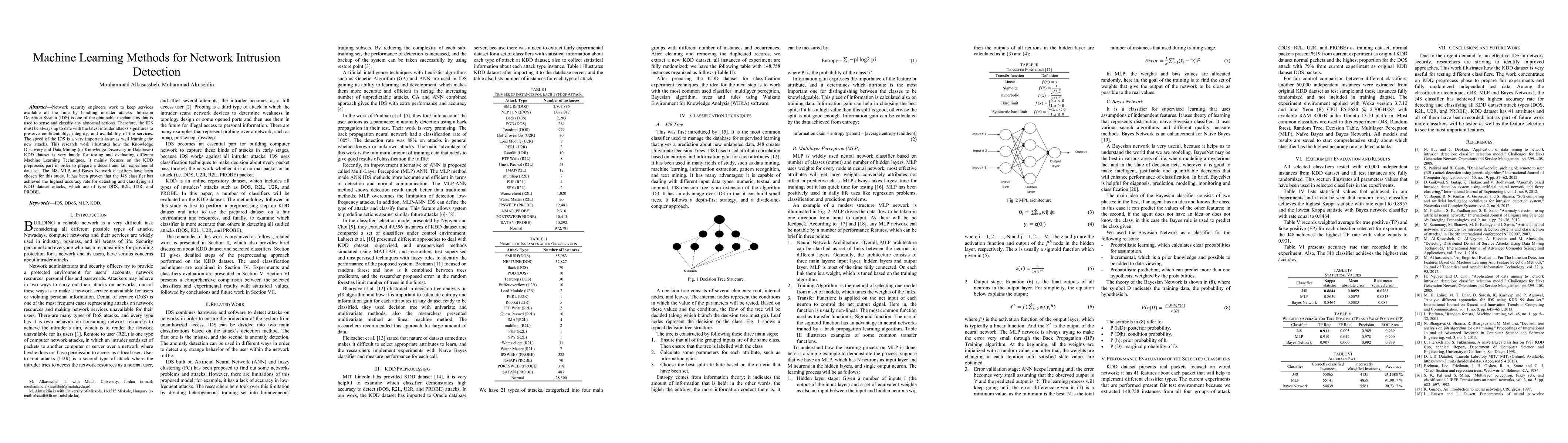 Network security engineers work to keep services available all the time by handling intruder attacks. Intrusion Detection System (IDS) is one of the obtainable mechanisms that is used to sense and classify any abnormal actions. Therefore, the IDS must be always up to date with the latest intruder attacks signatures to preserve confidentiality, integrity, and availability of the services. The speed of the IDS is a very important issue as well learning the new attacks. This research work illustrates how the Knowledge Discovery and Data Mining (or Knowledge Discovery in Databases) KDD dataset is very handy for testing and evaluating different Machine Learning Techniques. It mainly focuses on the KDD preprocess part in order to prepare a decent and fair experimental data set. The J48, MLP, and Bayes Network classifiers have been chosen for this study. It has been proven that the J48 classifier has achieved the highest accuracy rate for detecting and classifying all KDD dataset attacks, which are of type DOS, R2L, U2R, and PROBE.