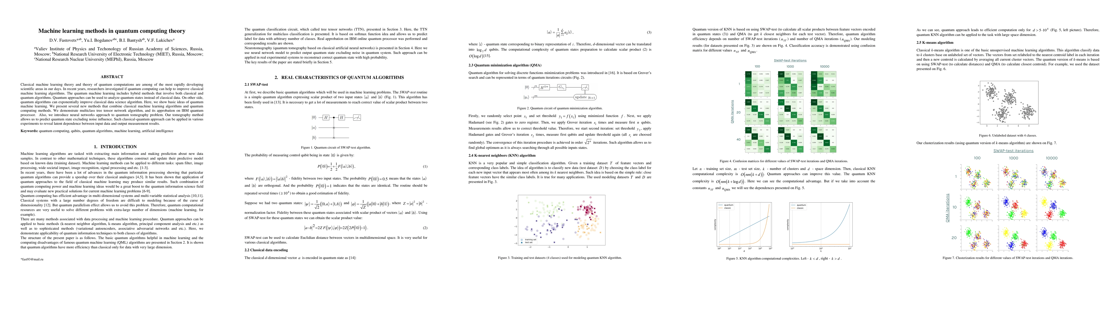 Classical machine learning theory and theory of quantum computations are among of the most rapidly developing scientific areas in our days. In recent years, researchers investigated if quantum computing can help to improve classical machine learning algorithms. The quantum machine learning includes hybrid methods that involve both classical and quantum algorithms. Quantum approaches can be used to analyze quantum states instead of classical data. On other side, quantum algorithms can exponentially improve classical data science algorithm. Here, we show basic ideas of quantum machine learning. We present several new methods that combine classical machine learning algorithms and quantum computing methods. We demonstrate multiclass tree tensor network algorithm, and its approbation on IBM quantum processor. Also, we introduce neural networks approach to quantum tomography problem. Our tomography method allows us to predict quantum state excluding noise influence. Such classical-quantum approach can be applied in various experiments to reveal latent dependence between input data and output measurement results.