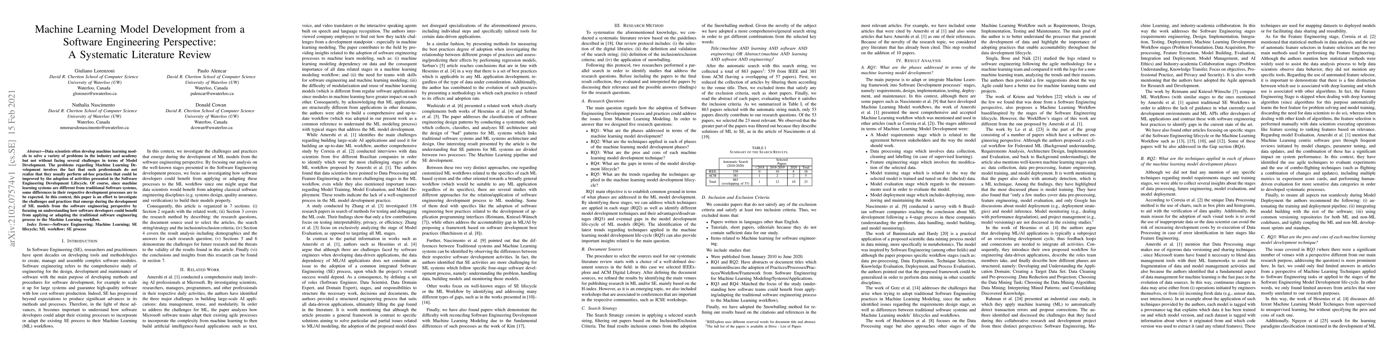 This paper systematically reviews literature to explore challenges and practices in developing machine learning models from a software engineering perspective, aiming to identify how traditional software engineering methodologies can be adapted to improve machine learning model development. It highlights the differences between machine learning and traditional software development and suggests potential benefits of integrating software engineering practices into machine learning workflows.