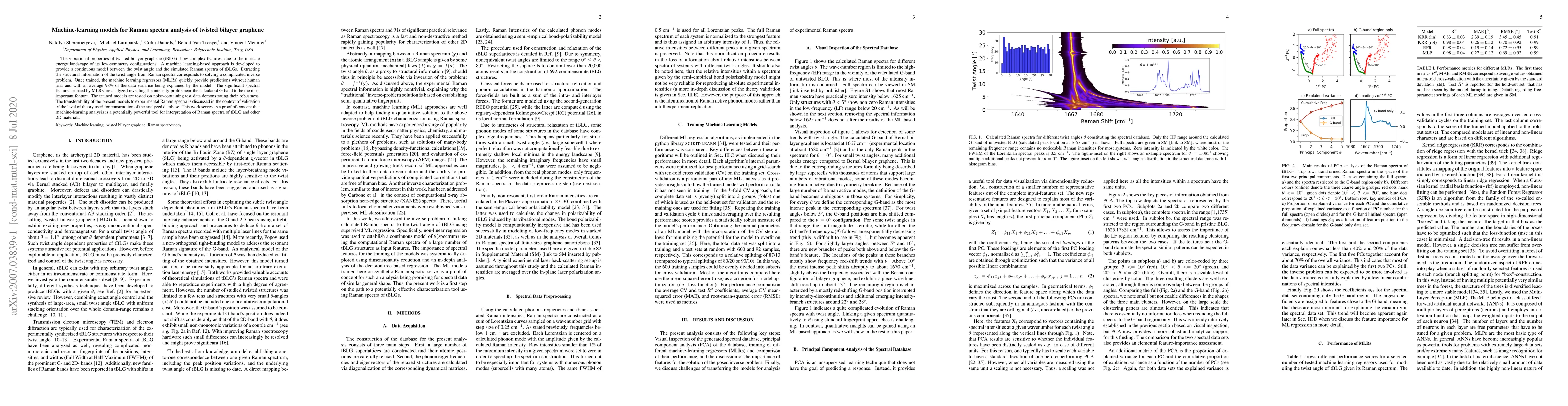 This research develops machine learning models to predict Raman spectra of twisted bilayer graphene (tBLG) based on twist angles, achieving 98% data variance explanation. The models reveal the G-band intensity profile as a key feature, demonstrating robustness and potential for interpreting Raman spectra of tBLG and other 2D materials.