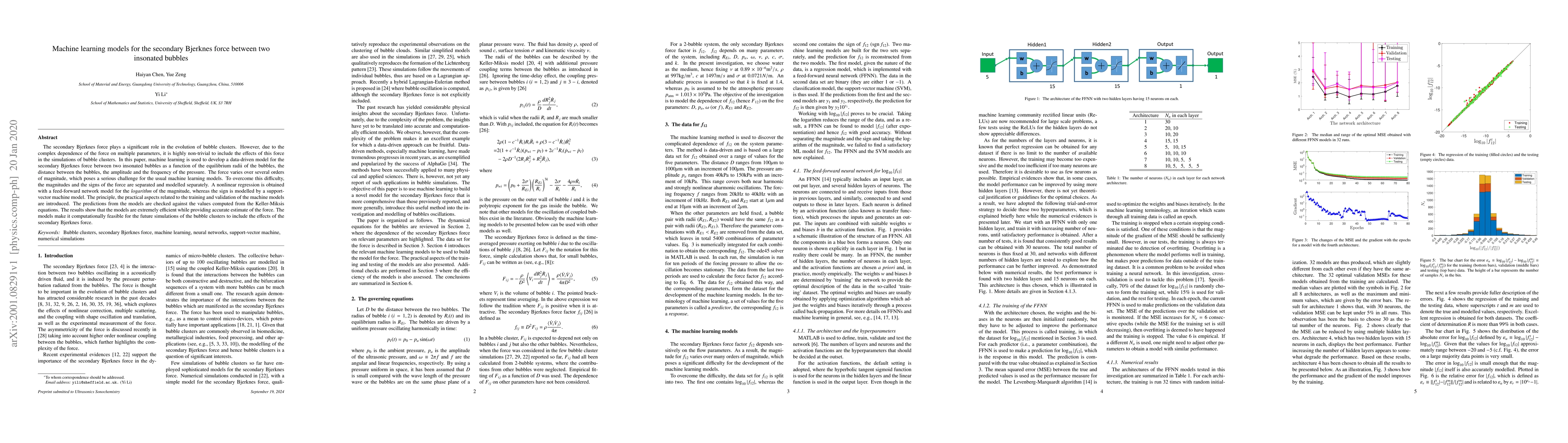 The secondary Bjerknes force plays a significant role in the evolution of bubble clusters. However, due to the complex dependence of the force on multiple parameters, it is highly non-trivial to include the effects of this force in the simulations of bubble clusters. In this paper, machine learning is used to develop a data-driven model for the secondary Bjerknes force between two insonated bubbles as a function of the equilibrium radii of the bubbles, the distance between the bubbles, the amplitude and the frequency of the pressure. The force varies over several orders of magnitude, which poses a serious challenge for the usual machine learning models. To overcome this difficulty, the magnitudes and the signs of the force are separated and modelled separately. A nonlinear regression is obtained with a feed-forward network model for the logarithm of the magnitude, whereas the sign is modelled by a support-vector machine model. The principle, the practical aspects related to the training and validation of the machine models are introduced. The predictions from the models are checked against the values computed from the Keller-Miksis equations. The results show that the models are extremely efficient while providing accurate estimate of the force. The models make it computationally feasible for the future simulations of the bubble clusters to include the effects of the secondary Bjerknes force.