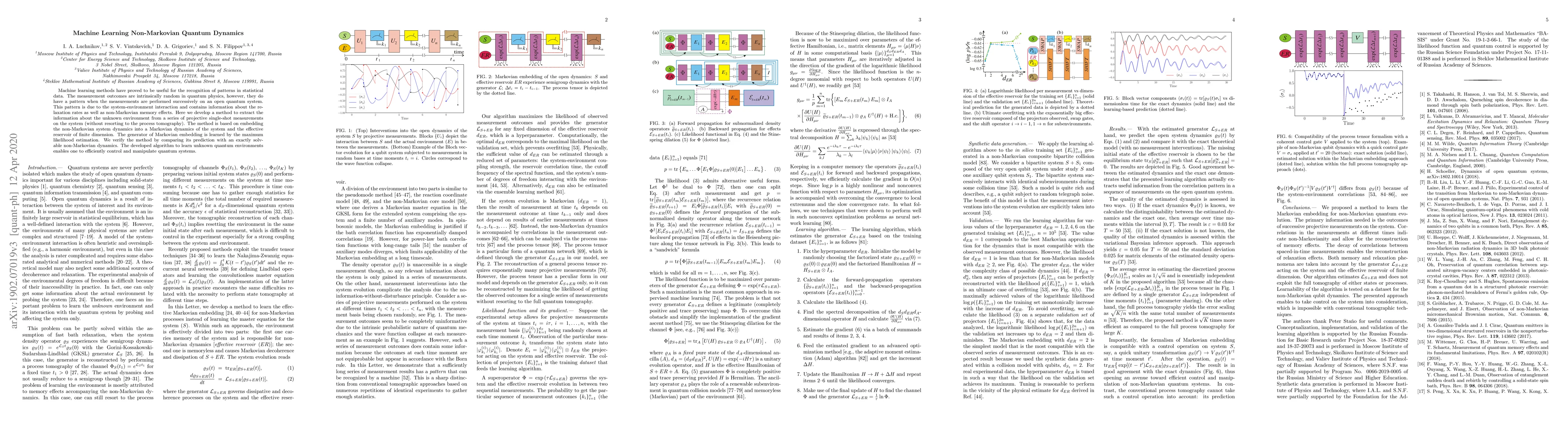 Machine learning methods have proved to be useful for the recognition of patterns in statistical data. The measurement outcomes are intrinsically random in quantum physics, however, they do have a pattern when the measurements are performed successively on an open quantum system. This pattern is due to the system-environment interaction and contains information about the relaxation rates as well as non-Markovian memory effects. Here we develop a method to extract the information about the unknown environment from a series of projective single-shot measurements on the system (without resorting to the process tomography). The method is based on embedding the non-Markovian system dynamics into a Markovian dynamics of the system and the effective reservoir of finite dimension. The generator of Markovian embedding is learned by the maximum likelihood estimation. We verify the method by comparing its prediction with an exactly solvable non-Markovian dynamics. The developed algorithm to learn unknown quantum environments enables one to efficiently control and manipulate quantum systems.