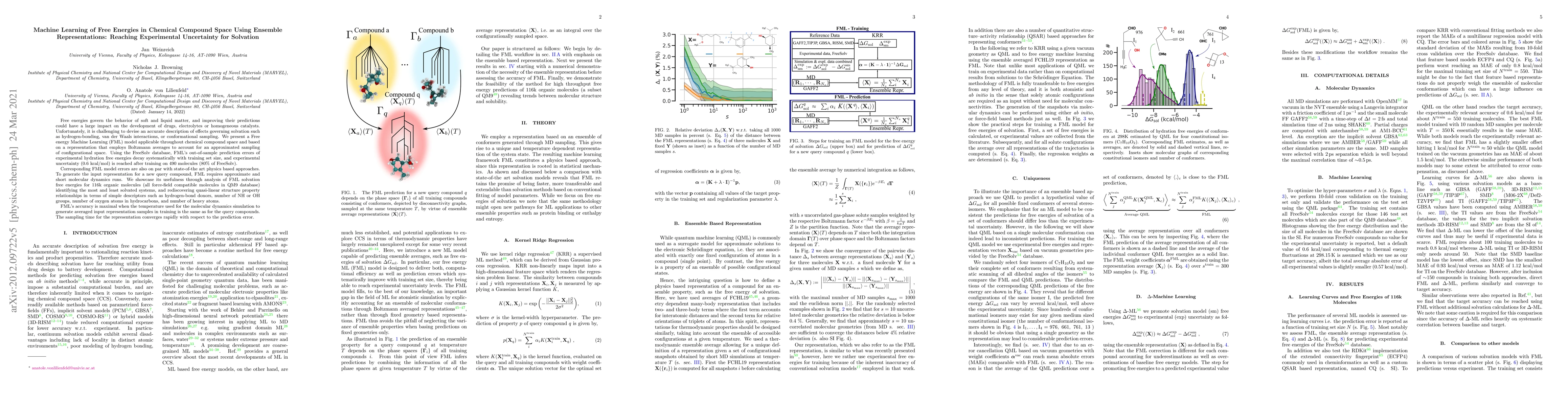 This paper presents a Free energy Machine Learning (FML) model that accurately predicts solvation free energies across chemical compound space, achieving experimental uncertainty levels. The FML model uses ensemble representations based on Boltzmann averages to approximate configurational sampling, and it achieves state-of-the-art prediction accuracy comparable to physics-based methods.