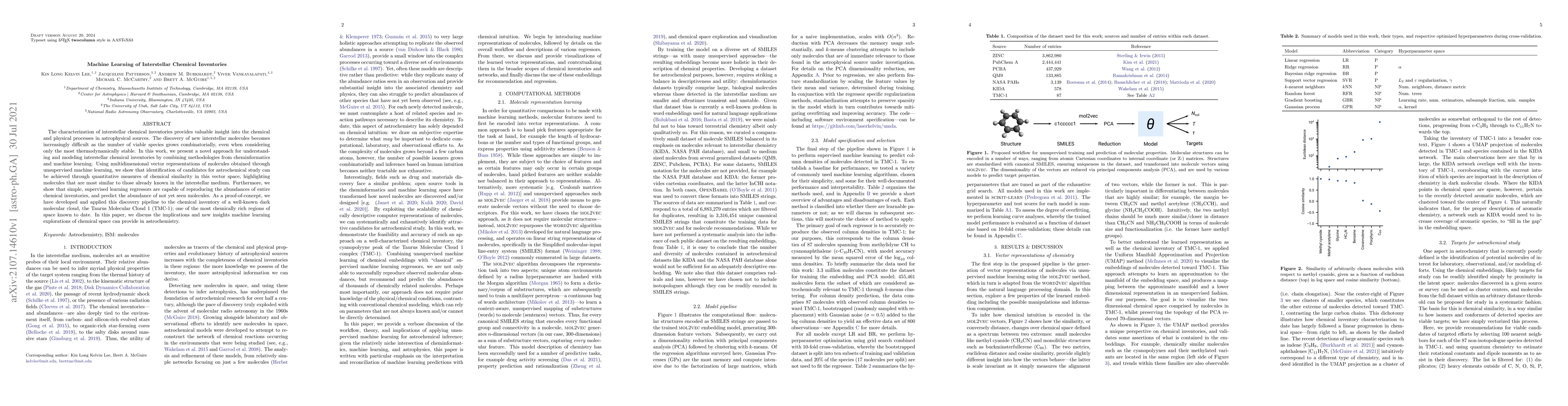 The characterization of interstellar chemical inventories provides valuable insight into the chemical and physical processes in astrophysical sources. The discovery of new interstellar molecules becomes increasingly difficult as the number of viable species grows combinatorially, even when considering only the most thermodynamically stable. In this work, we present a novel approach for understanding and modeling interstellar chemical inventories by combining methodologies from cheminformatics and machine learning. Using multidimensional vector representations of molecules obtained through unsupervised machine learning, we show that identification of candidates for astrochemical study can be achieved through quantitative measures of chemical similarity in this vector space, highlighting molecules that are most similar to those already known in the interstellar medium. Furthermore, we show that simple, supervised learning regressors are capable of reproducing the abundances of entire chemical inventories, and predict the abundance of not yet seen molecules. As a proof-of-concept, we have developed and applied this discovery pipeline to the chemical inventory of a well-known dark molecular cloud, the Taurus Molecular Cloud 1 (TMC-1); one of the most chemically rich regions of space known to date. In this paper, we discuss the implications and new insights machine learning explorations of chemical space can provide in astrochemistry.