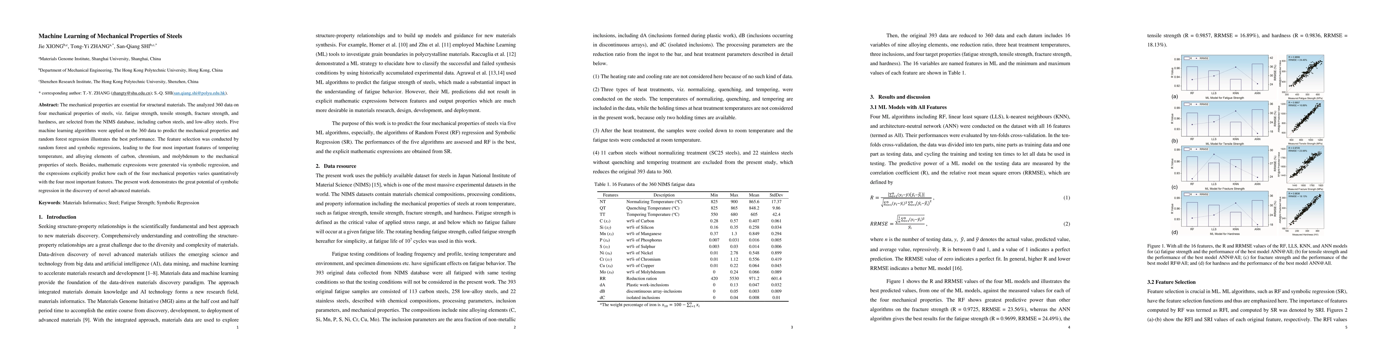 The mechanical properties are essential for structural materials. The analyzed 360 data on four mechanical properties of steels, viz. fatigue strength, tensile strength, fracture strength, and hardness, are selected from the NIMS database, including carbon steels, and low-alloy steels. Five machine learning algorithms were applied on the 360 data to predict the mechanical properties and random forest regression illustrates the best performance. The feature selection was conducted by random forest and symbolic regressions, leading to the four most important features of tempering temperature, and alloying elements of carbon, chromium, and molybdenum to the mechanical properties of steels. Besides, mathematic expressions were generated via symbolic regression, and the expressions explicitly predict how each of the four mechanical properties varies quantitatively with the four most important features. The present work demonstrates the great potential of symbolic regression in the discovery of novel advanced materials.