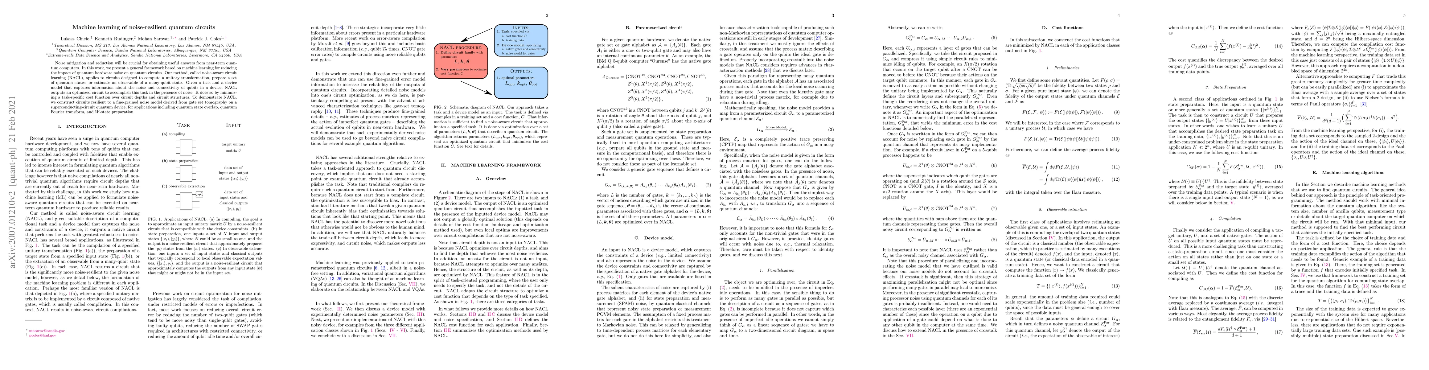 This paper introduces a machine learning framework called noise-aware circuit learning (NACL) to reduce the impact of quantum hardware noise on quantum circuits. NACL optimizes circuits for various tasks by minimizing a task-specific cost function, demonstrating its effectiveness through circuits resilient to noise on a superconducting-circuit quantum device.