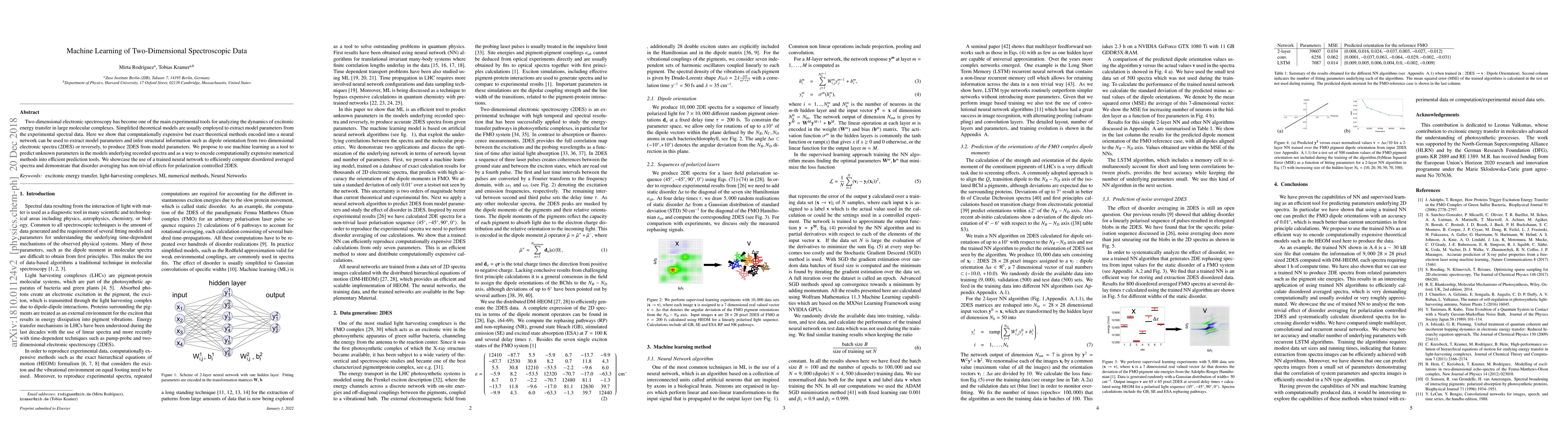 Two-dimensional electronic spectroscopy has become one of the main experimental tools for analyzing the dynamics of excitonic energy transfer in large molecular complexes. Simplified theoretical models are usually employed to extract model parameters from the experimental spectral data. Here we show that computationally expensive but exact theoretical methods encoded into a neural network can be used to extract model parameters and infer structural information such as dipole orientation from two dimensional electronic spectra (2DES) or reversely, to produce 2DES from model parameters. We propose to use machine learning as a tool to predict unknown parameters in the models underlying recorded spectra and as a way to encode computationally expensive numerical methods into efficient prediction tools. We showcase the use of a trained neural network to efficiently compute disordered averaged spectra and demonstrate that disorder averaging has non-trivial effects for polarization controlled 2DES.
