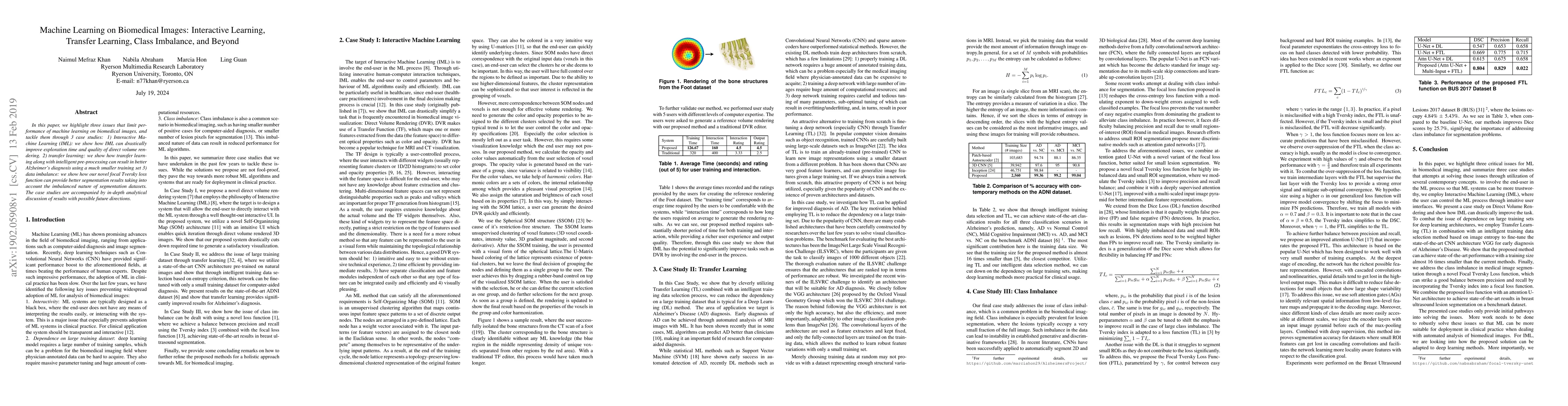 This paper addresses challenges in machine learning for biomedical imaging, proposing solutions through Interactive Machine Learning (IML) for efficient image exploration, Transfer Learning with smart preprocessing for improved Alzheimer's diagnosis with less data, and a novel Focal Tversky Loss function to handle imbalanced segmentation datasets, with detailed analysis and future directions.