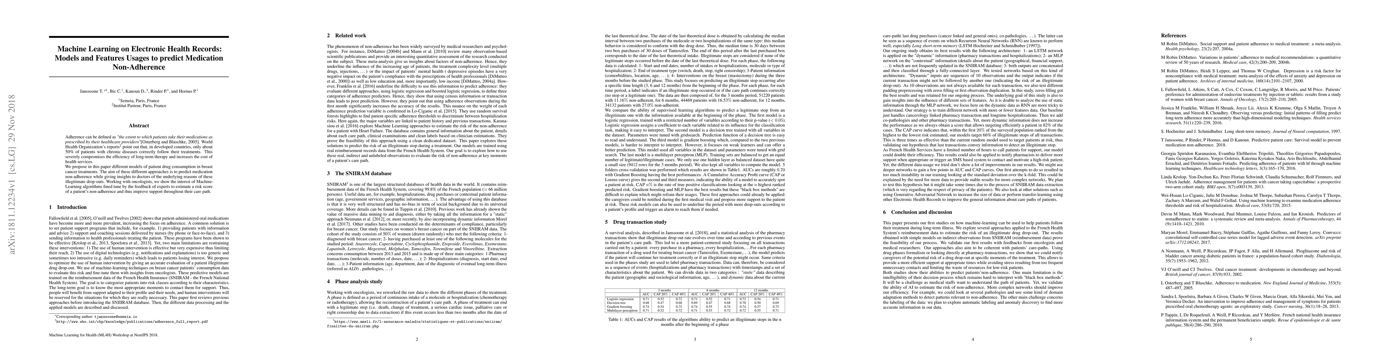 Adherence can be defined as "the extent to which patients take their medications as prescribed by their healthcare providers"[Osterberg and Blaschke, 2005]. World Health Organization's reports point out that, in developed countries, only about 50% of patients with chronic diseases correctly follow their treatments. This severely compromises the efficiency of long-term therapy and increases the cost of health services. We propose in this paper different models of patient drug consumption in breast cancer treatments. The aim of these different approaches is to predict medication non-adherence while giving insights to doctors of the underlying reasons of these illegitimate drop-outs. Working with oncologists, we show the interest of Machine- Learning algorithms fined tune by the feedback of experts to estimate a risk score of a patient's non-adherence and thus improve support throughout their care path.